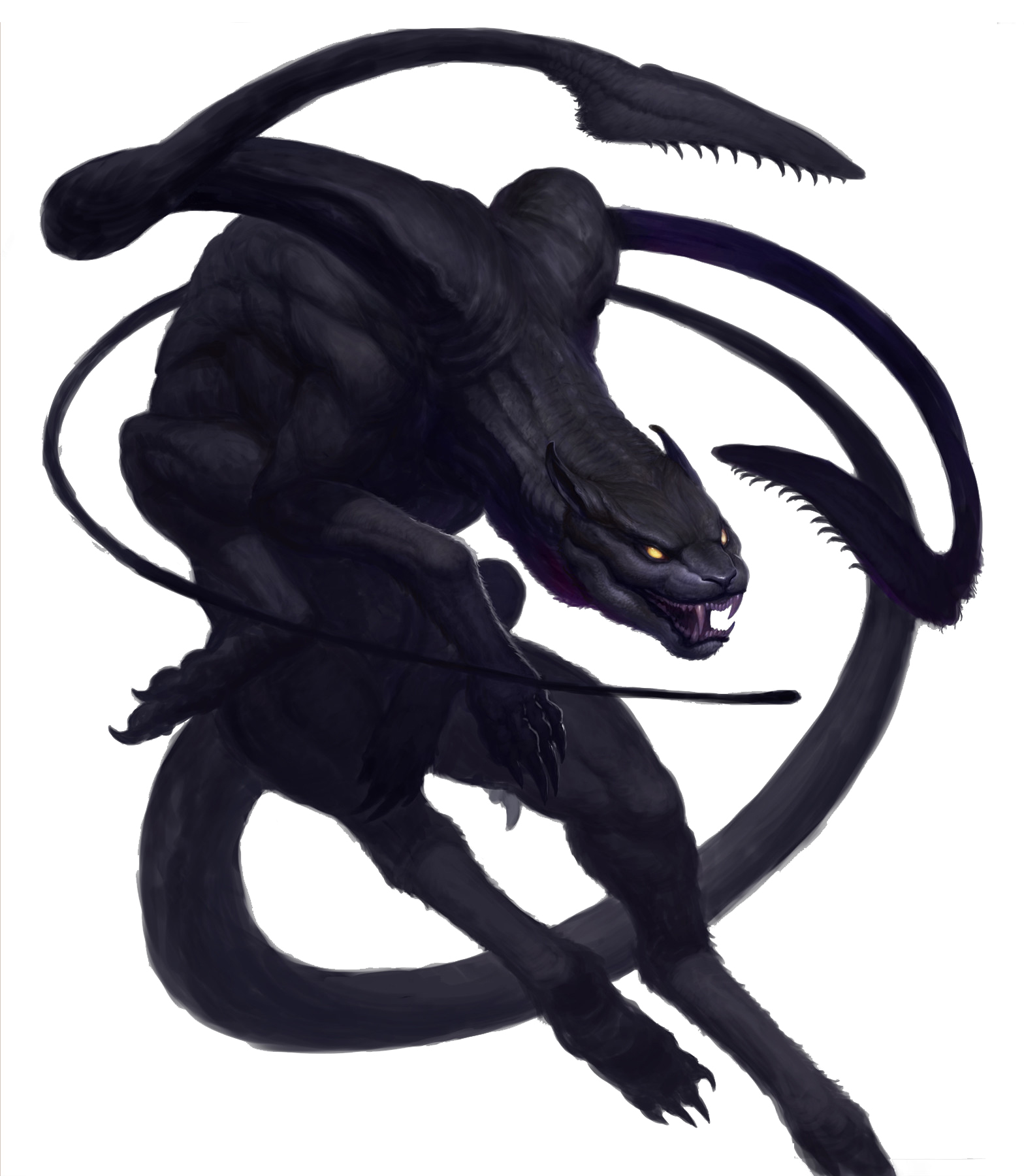 Taken from an unknown world by the unseelie court of the fey to be used as pets and hunting companions, displacer beasts are ferocious and deceptively intelligent creatures of feline appearance. Since their original abduction they have broken out of their captivity and would have hunted their original masters to extinction where it not for their bitter enemies the blink dogs, facing extinction at their jaws most of them fled the Feywild and have since become naturalized to the Material Plane where they thrive thanks to their natural hunting ability, displacement ability, and keen intellect some even going as far as learning to speak with and entreating with other sapient species, though many humanoids would be remiss to associate with such a fearsome predator their abilities cannot be denied and are an asset to any adventuring party willing to take the risk.