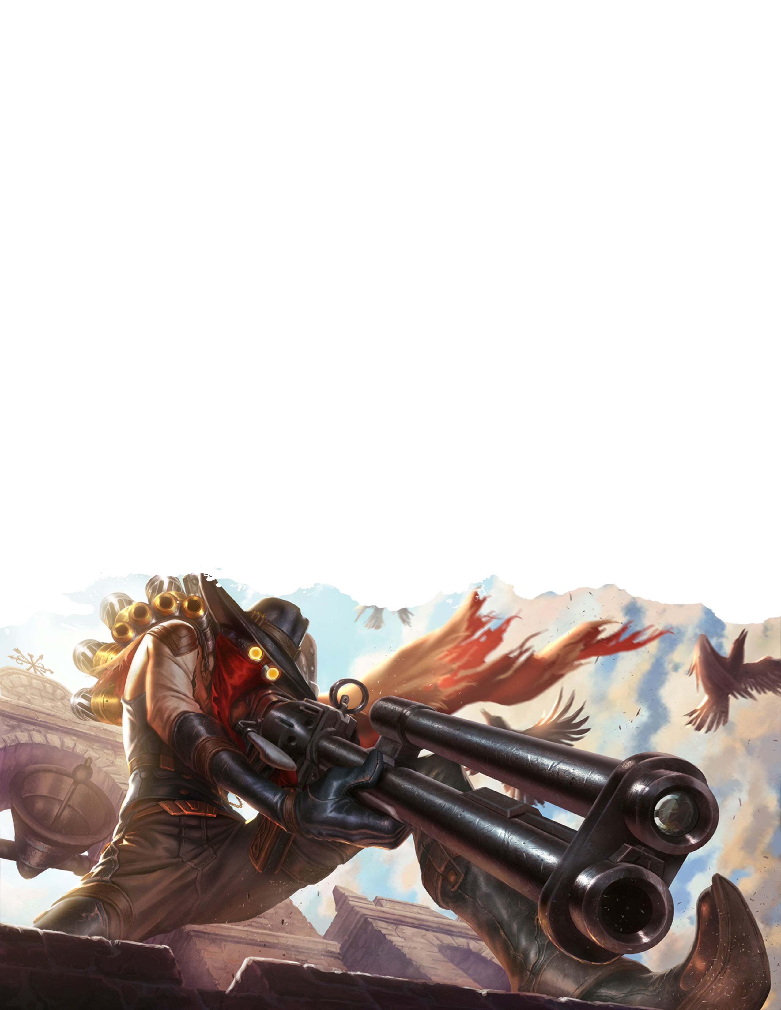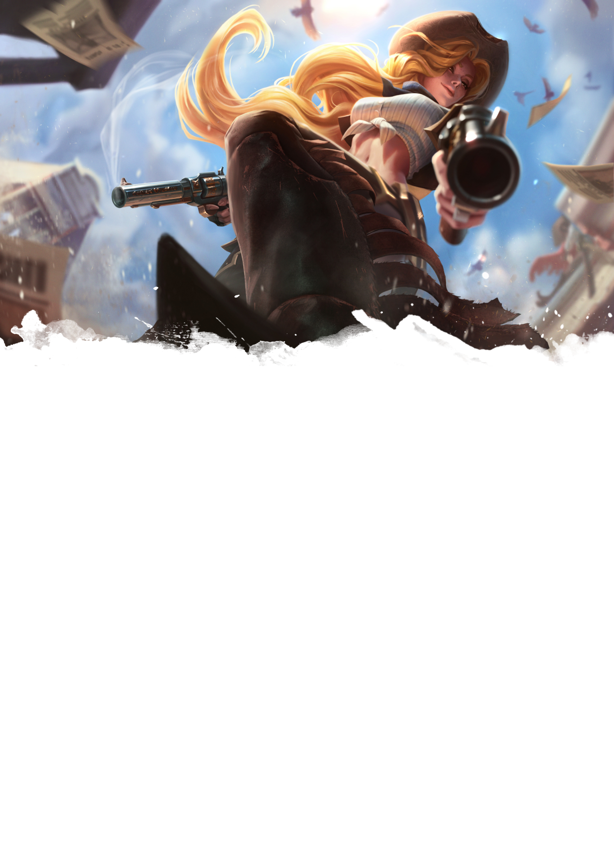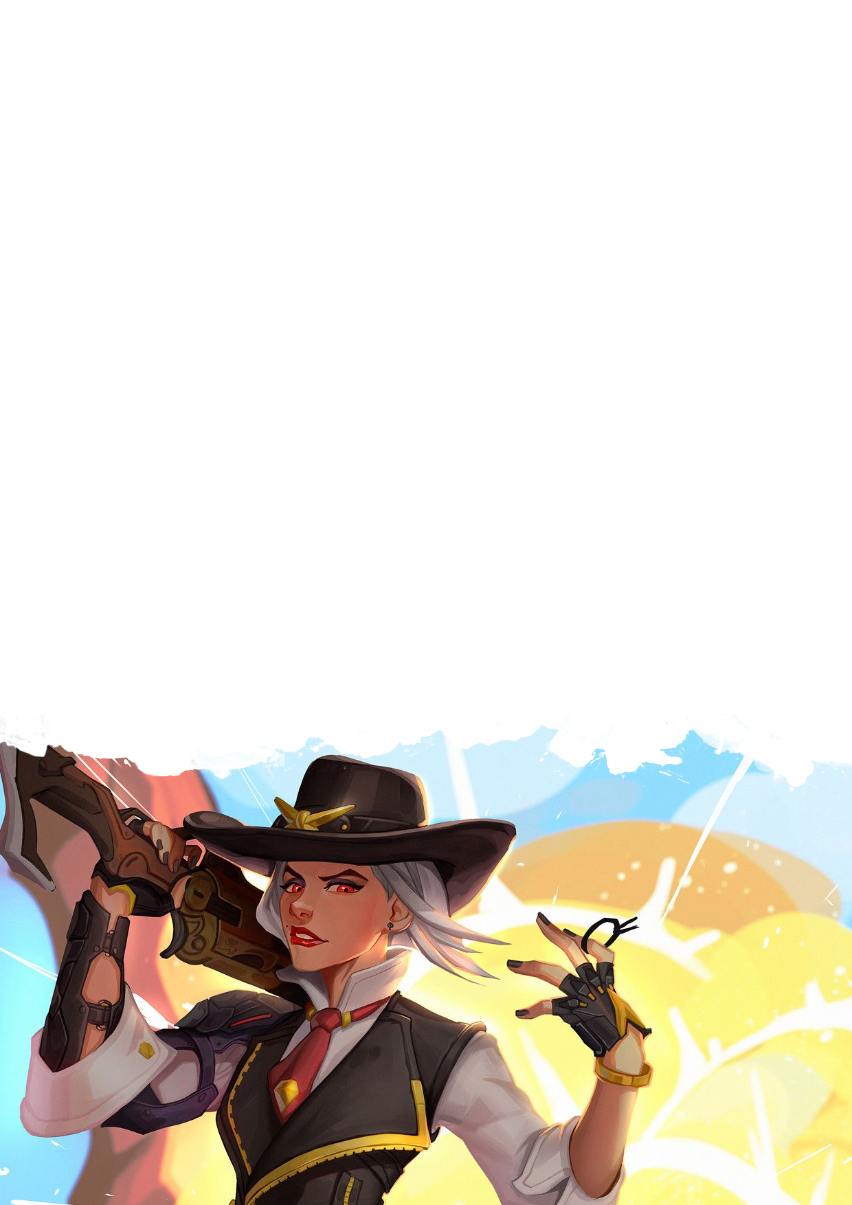 The cover image is a modified version of the "Gunfighter Ballads and Trail Songs" album by Marty Robbins cover. The artwork in page 3 was made by Herbie Wang. The one in page 6 is splash art from the game League of Legends, specifically the High Noon Miss Fortune skin, made by Jessica Oyhenart. The artwork in page 8 is also LoL splash art, this time of the High Noon Jhin skin by Alvinlee . Riot Games holds the copyright for these last two. Finally, the last image is a fanart of Ashe from Overwatch by EvaSoloArt .