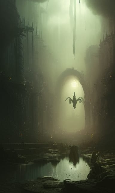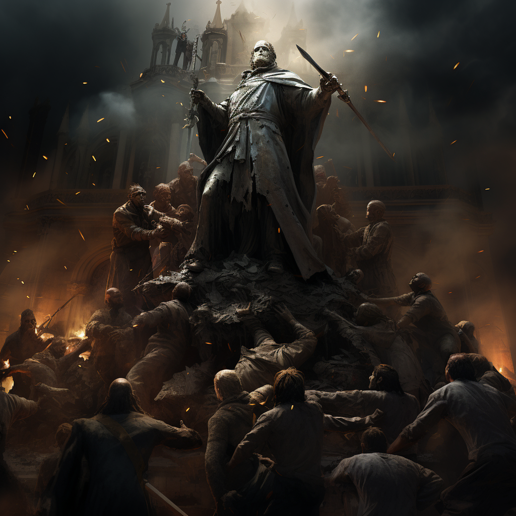 A divine being gazes down on the Earth as the souls of the faithful rise from their crypts, following it's guidance into the afterlife. Meanwhile, the souls of the wicked are being dragged into damnation by monstrous beings wielding red-hot, spiked chains.
