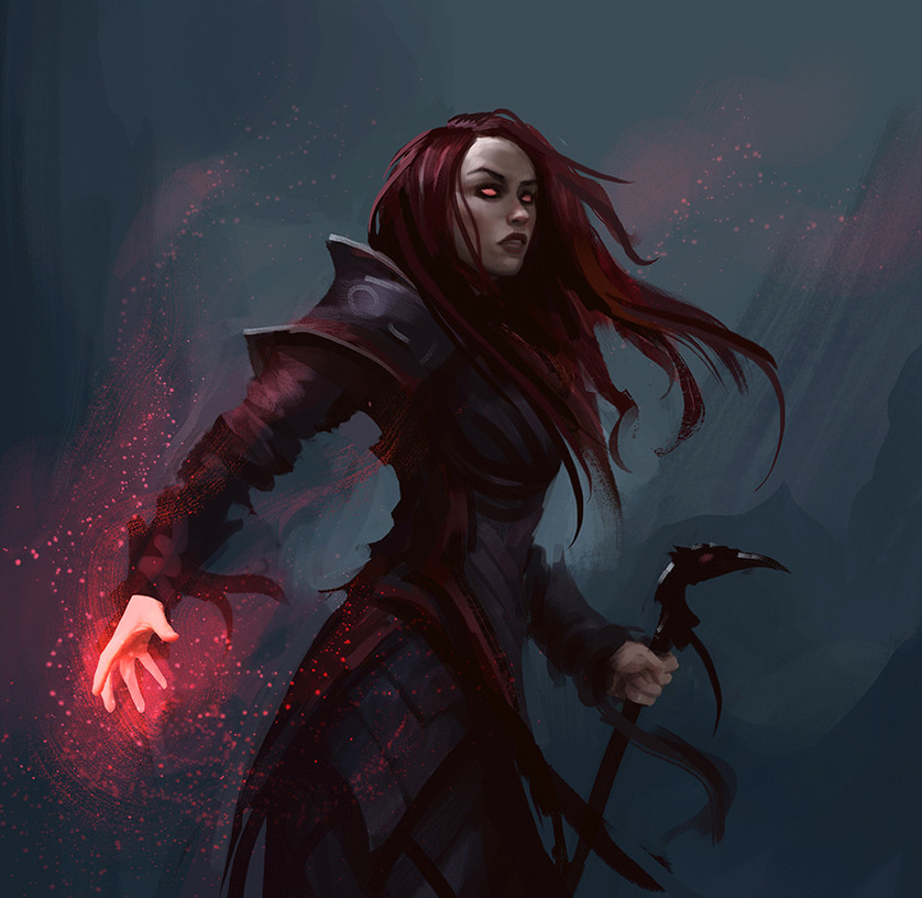 As flames spring to life in her hands, a wizened human whispers the secret name of her demonic patron, infusing her spell with fiendish magic.