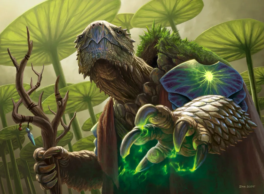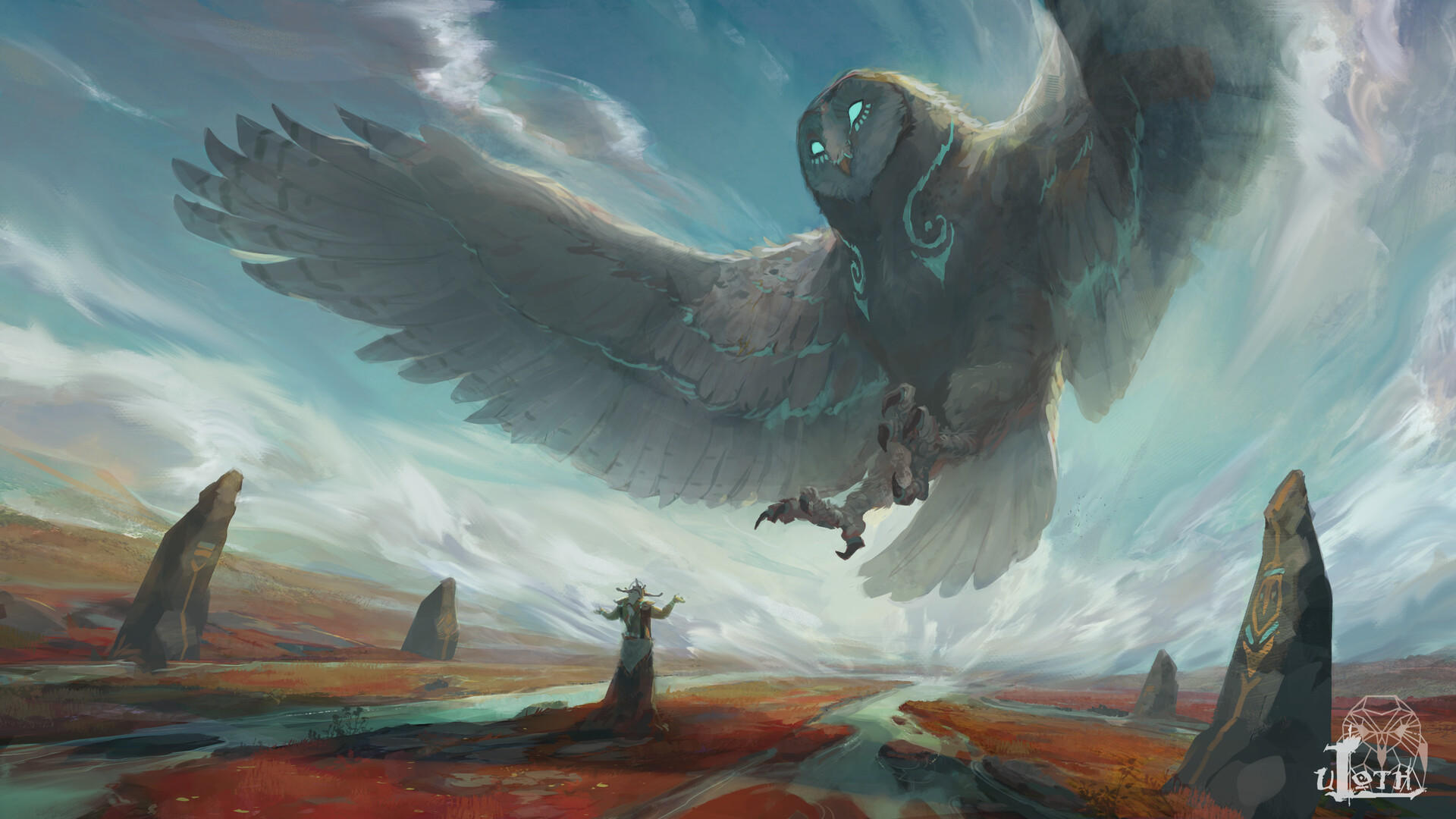 An adventuring party is set upon by a great ettin, swinging its club with abandon. Fearing the strength of this giant, an elf grasps a wood-carved totem, channeling spiritual magic through it. The ettin begins to slow, its strength suddenly waning from the elf's curse.
