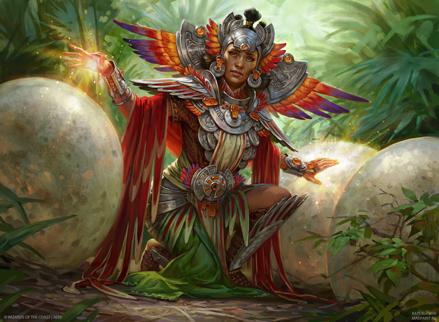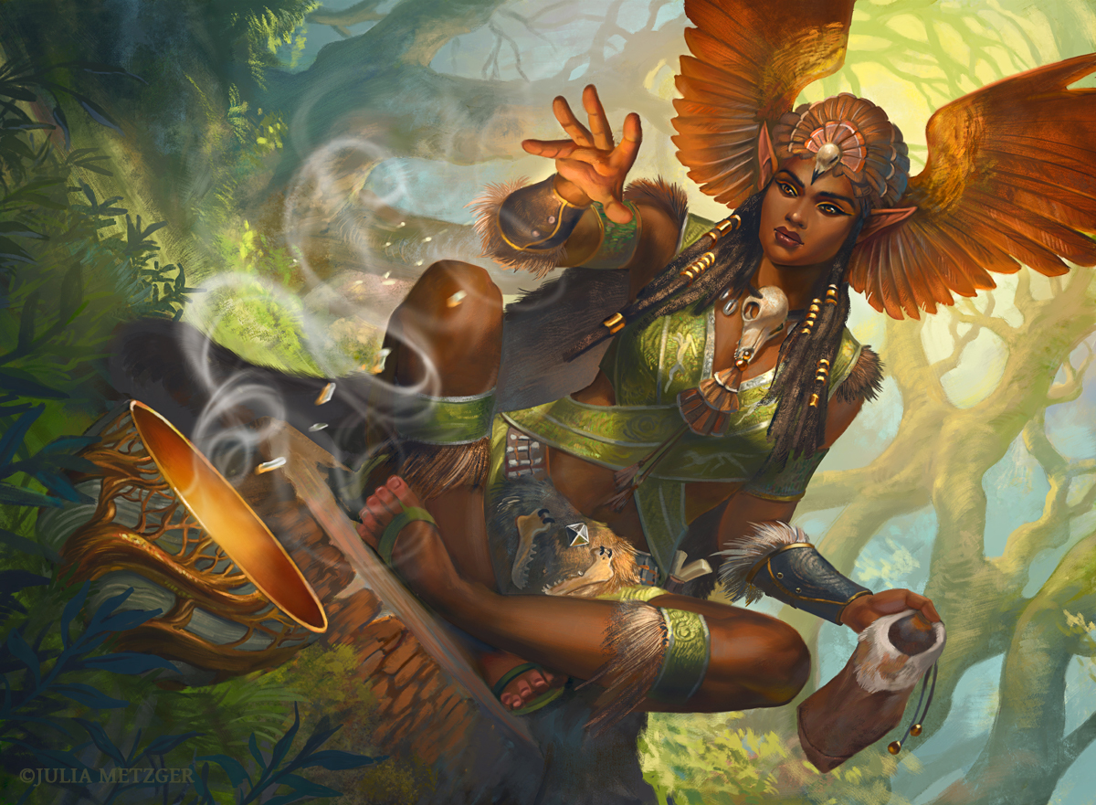 A tribal leader stands conversing with a rival warparty. Hoping to avoid conflict, the leader chooses his words carefully to not offend the warriors. Unknown to all others, the spirit of his long departed ancestor, legendary for his silver-tongue, is whispering exactly what to say.