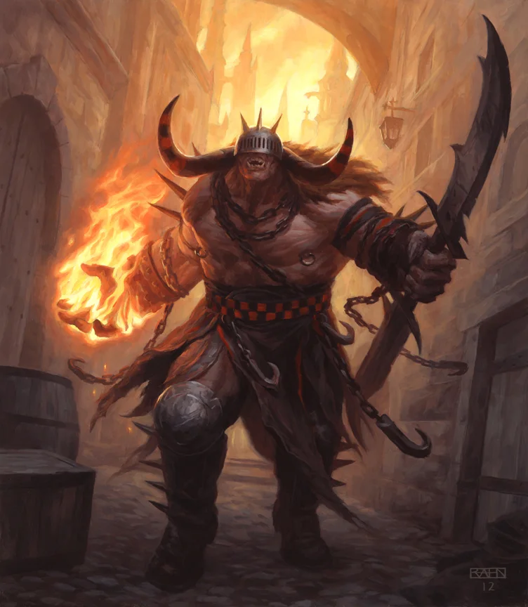 Hellfire oni are the infernal counterparts to their demonic relative, the dread oni. Whereas dread oni are corrupted by exposure to the chaotic magic of the Abyss, hellfire oni are typically granted their unique abilities through contracts with powerful devils in the Nine Hells.