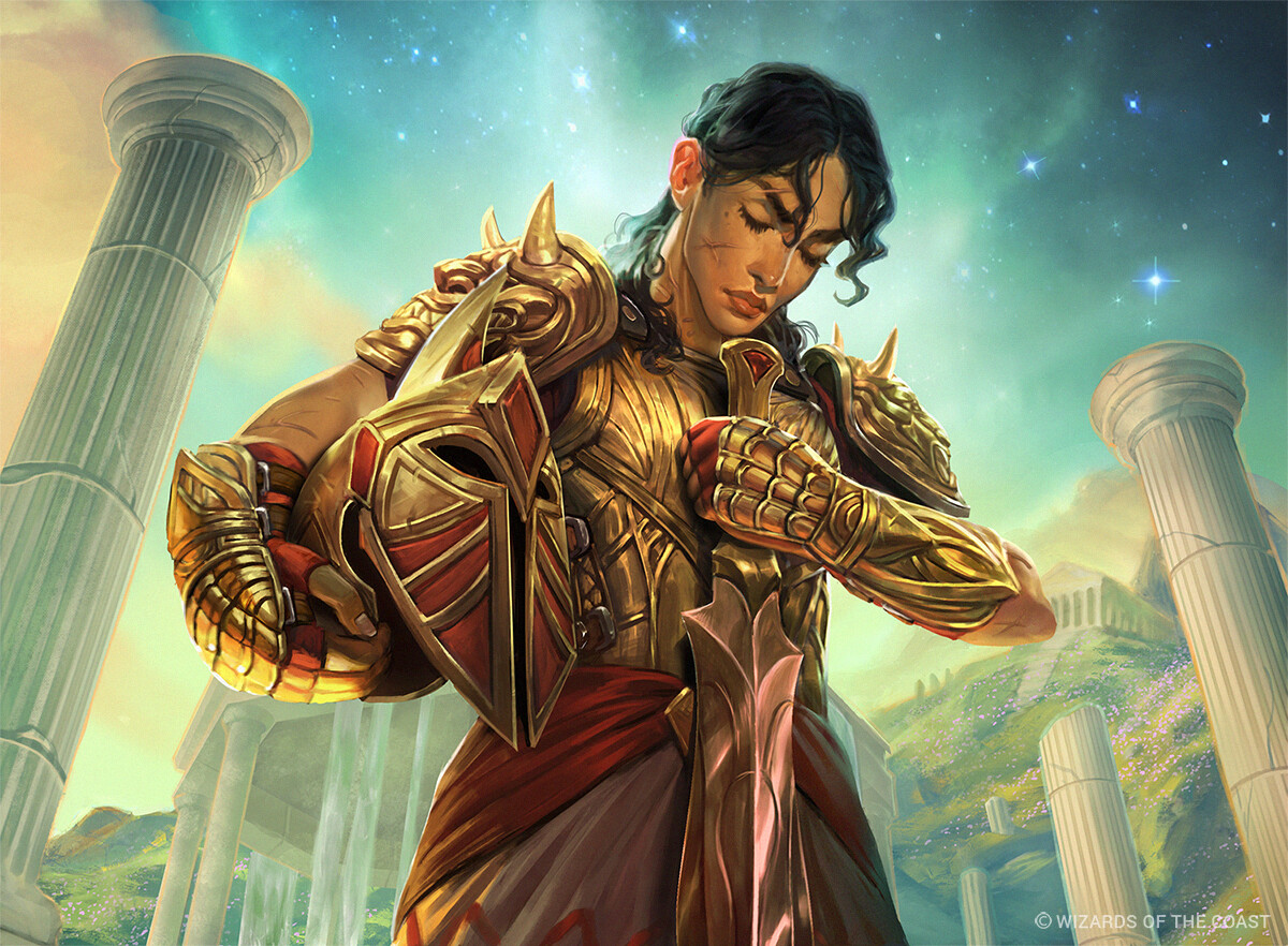 Clad in plate armor that gleams in the sunlight despite the dust and grime of long travel, a human lays down her sword and shield and places her hands on a mortally wounded man. Divine radiance shines from her hands, the man’s wounds knit closed, and his eyes open wide with amazement.