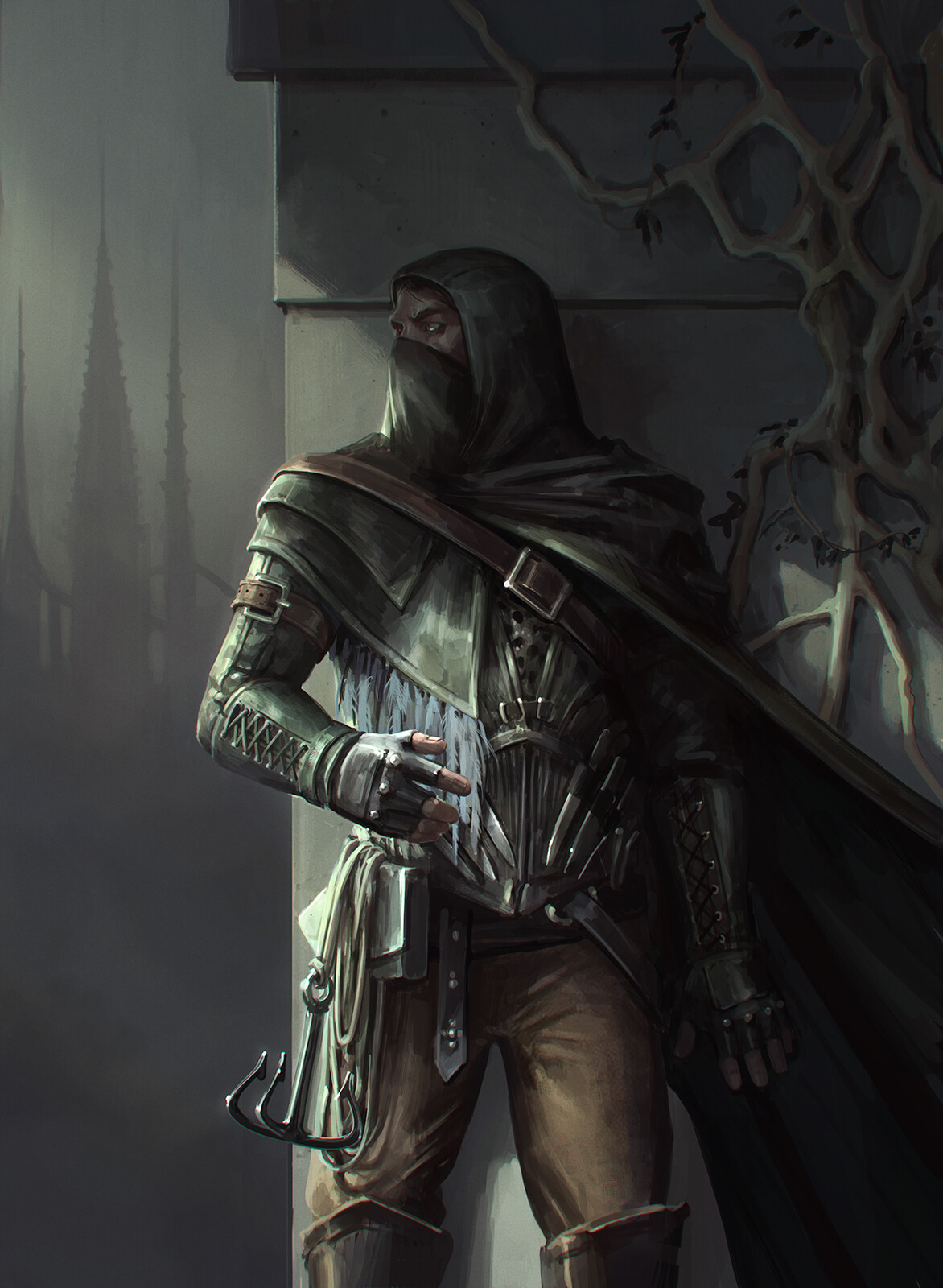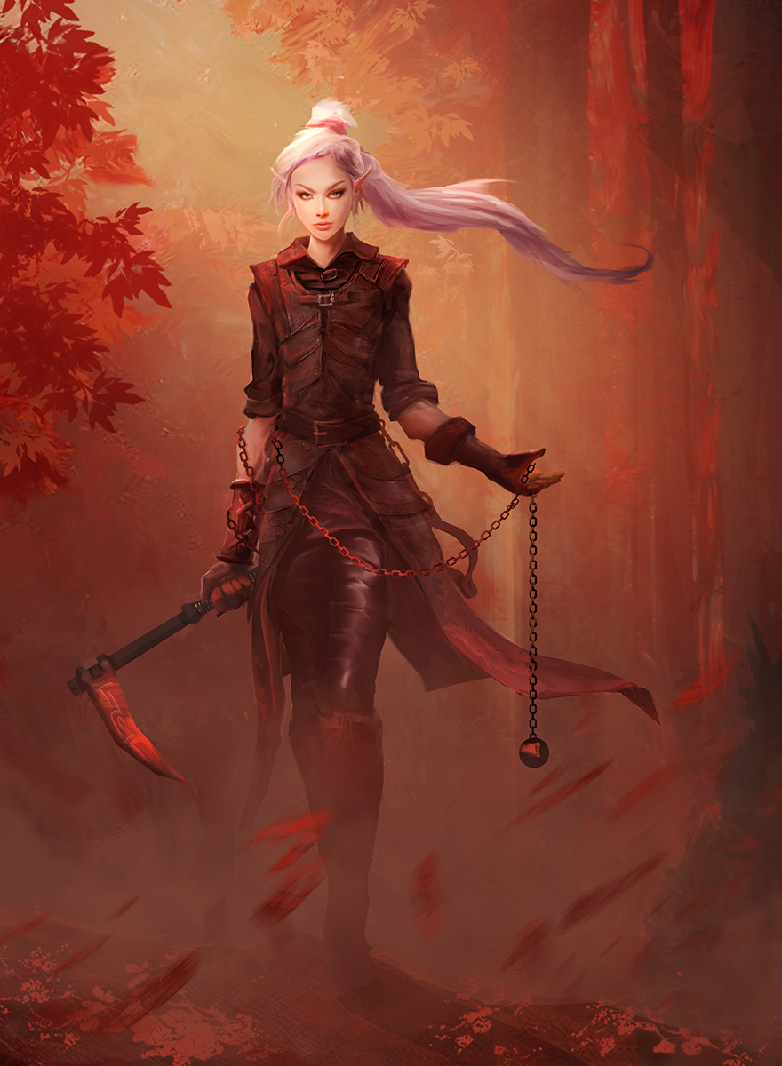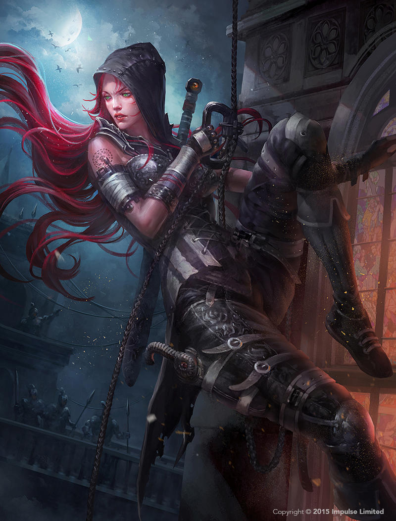 A human lurks in the shadows of an alley while his accomplice prepares for her part in the ambush. When their target — a notorious slaver — passes the alleyway, the accomplice cries out, the slaver comes to investigate, and the assassin’s blade cuts his throat before he can make a sound.