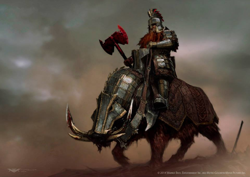 Seeing the oncoming, rampaging orcs, a dwarvish warrior plants his pike into the ground, bright heraldric ribbons flowing from its shaft. He draws his axe as his comrades assemble around him, empowered by his valiant bravery and inspiring heraldry.
