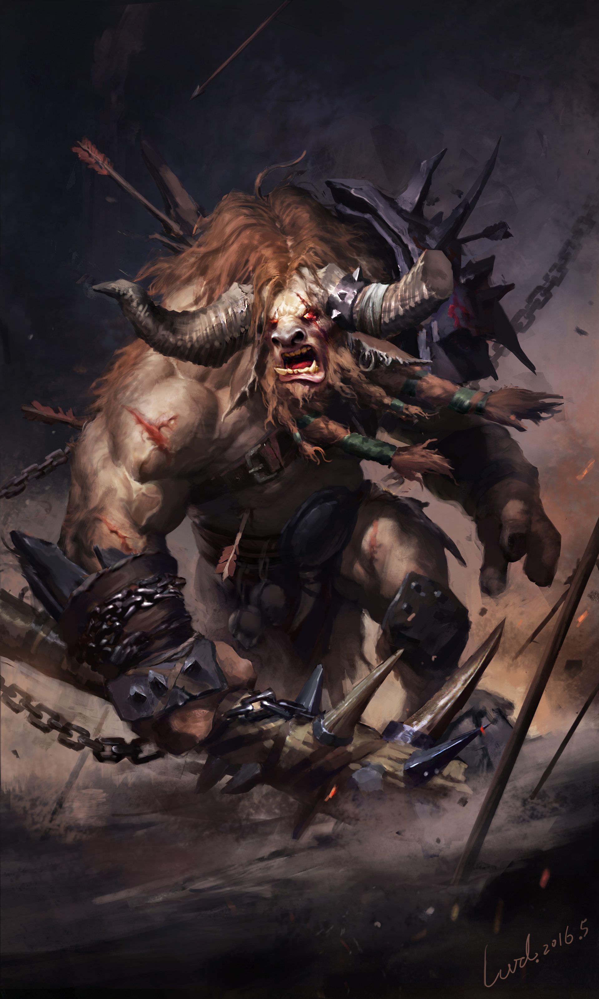 The Bestigors are the hardcore elite of the Beastmen tribes, warriors that are blessed with the most spectacular horns and possess of a mighty constitution and raw physical power that puts others of his kind to shame. As well as being stronger, they tend to be more disciplined, forming more organised ranks in battle than their quarrelsome lesser brethren, and they restrain themselves from their more disruptive excesses. They always wield the best weapons and wear the best armor available to the herd, sometimes even using weaponry culled from the corpses of their enemies. Because of their size and ferocity the Bestigors carve out a privileged position within the warherd, constantly enforcing their superiority upon the Gors and Ungors with random acts of excessive violence. This is a high honor, and the Bestigors pledge to fight to the death for the Beastlord.