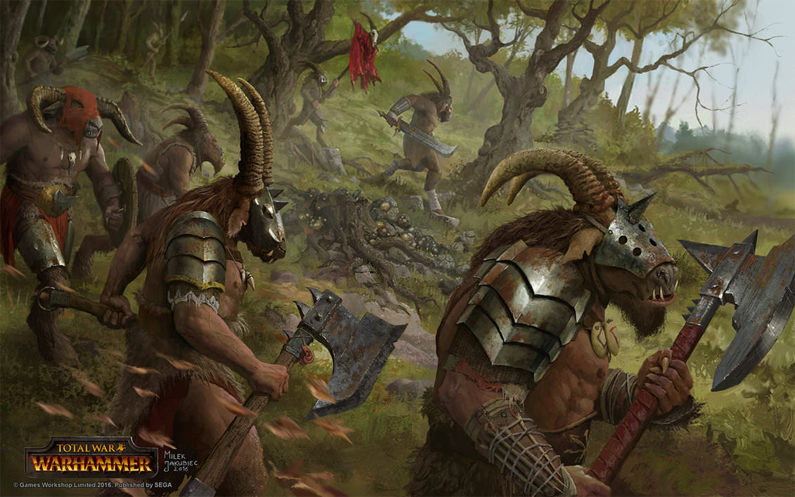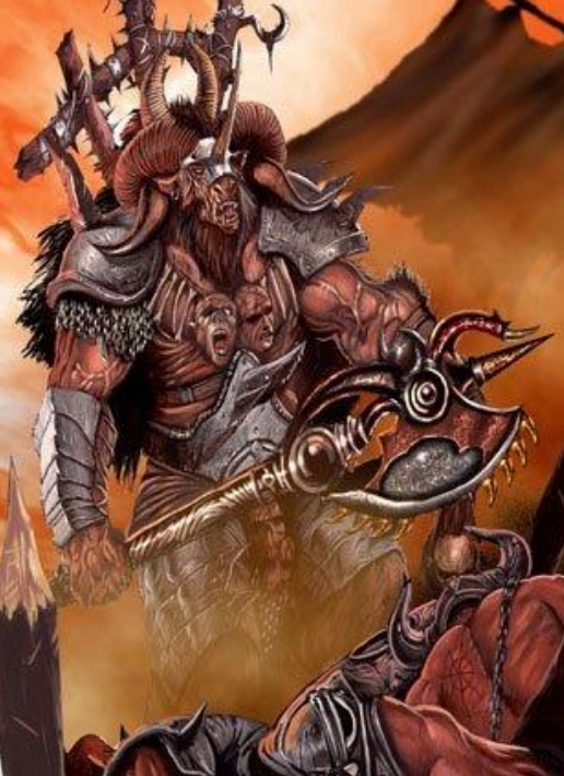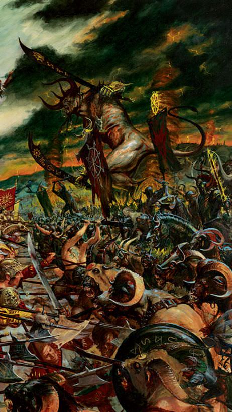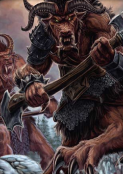The Beastmen, sometimes known as the Cloven Ones, the Horned Ones, the Beast of Chaos or even the Children of Chaos are a race of savage mutant humanoids that bear various traits of bestial appearance, such as cloven hooves, muscular human bodies, horned bestial heads and a malign primitive intelligence. Proud of their origins, it is said that they are the descendants of ancient humans corrupted and twisted by the influence of Chaos at the dawn of Chaos's coming into the world. From deep within the twisted forested woodlands of the Old World and beyond, the Beastmen are a violent, war driven race that seeks only to plague and destroy the civilizations of Mankind. They prey on the weak and defenseless, striking at lonely settlements without warning in a rampage of destruction before disappearing into the protective darkness of their dark wilderness, running away from the dire retribution that fails to follow.