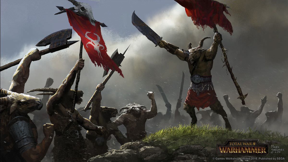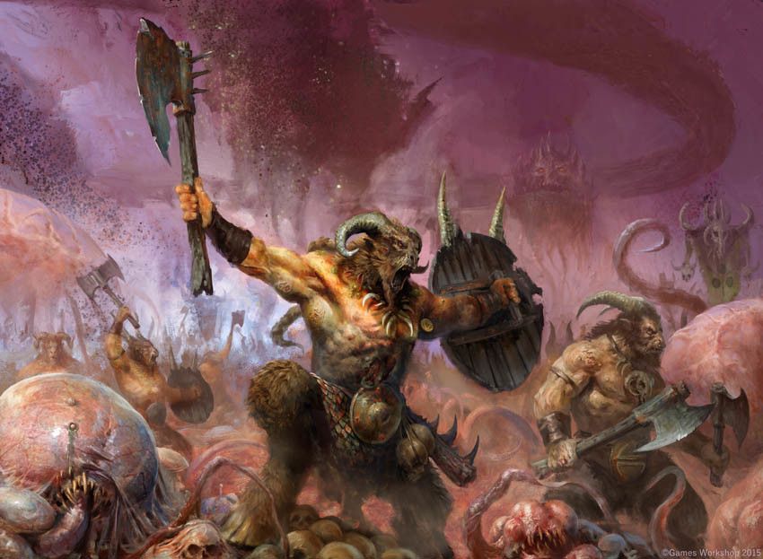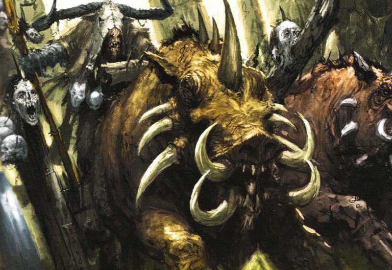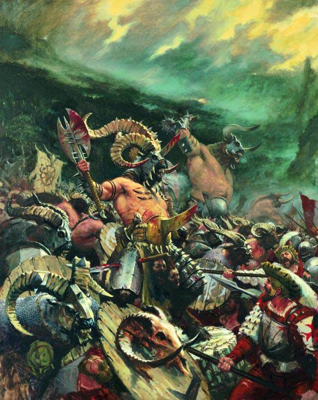"When the world was very young, a group of nomads drifted north into the icy steppes where they tamed wild dogs to help herd wild boar, long horned cattle, and goats, which they raised for food and clothing. When the Gate of Heaven collapsed, Chaos was released into our world, saturating the people of the north. The loosed energy of Chaos melded these poor simple folk with their herds and other animals, warping them into the Beastmen we recognise today."