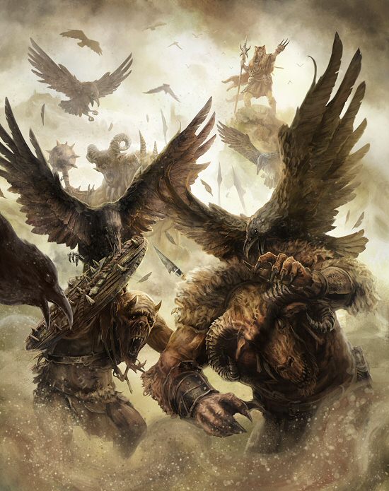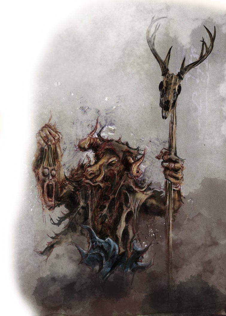 Bray Shamans are born into magic, and wield it with an instinctive ease. A palpable miasma of fell sorcery surrounds them, and when their wrath is roused reality itself is distorted and maimed. Tree roots twist and writhe at their passing, the undergrowth boils with unholy life and repugnant parasites scurry at their feet. It is said that the Bray Shamans can take the form of the beasts of the wild wood, the better to spy upon Mankind. Countless are the tales of death and war presaged by visitations of evil eyed crows, owls or foxes. Many superstitions regarding such beasts grip the hearts of men, particularly in the most far flung townships and military outposts.