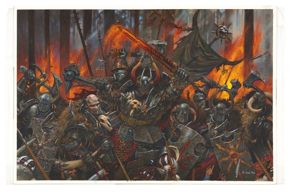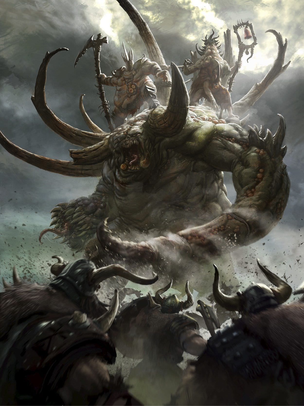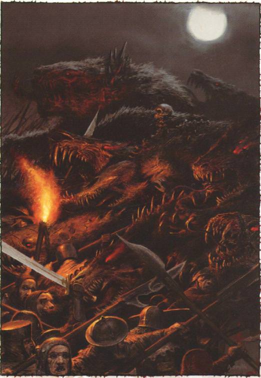 Fall of Middenland. Archaon, the Three Eyed, Warrior King of the North, High King of Norsca, High Zar of Kurgan, Everchosen of the Dark Gods and the greatest warrior ever to walk the earth, was on the march. In his wake came the full might of all the North; every tribe and warrior of Norsca who had proffered sword oath that they might fight the Final, Glorious battle to seal the fate of the world. Upon this mighty Horde were all the eyes of their ascendant gods. The mighty fleet of longships made landfall upon the straits of Kislev, unopposed, but not unobserved. A thousand thousand beady red eyes that watched from the shadows widened in fear as tribe after tribe of savage Norscans waded ashore. Soon, the old Nordland coast was thick for miles with black armoured, horn helmed Northlanders. Yet still, the warriors of the North flooded the shore. The veil between worlds was rent by the sickly luminescence of the black halo that was the remains of the Witch Moon Morrsleib, causing hordes of daemons to caper into blasphemous existence on the edges of the great freigattur.