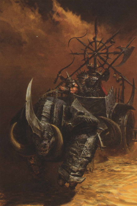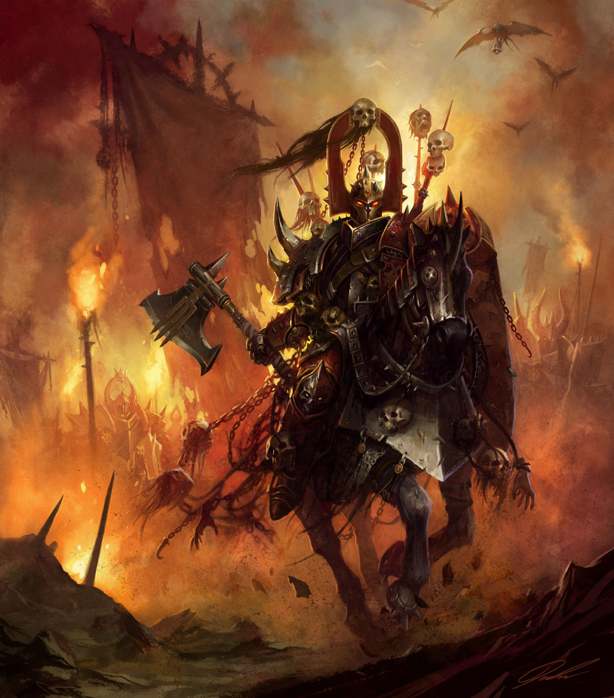 The Onslaught had devolved into little more than a wild mob of savage warriors by the time they had reached the Steilstrasse. Drunk on slaughter and caked in offal, crimson armored Norse champions thundered forth on brass skinned Juggernauts, their runed axes reaping a frightening toll from their foes. Matchless warriors of the Skullrage, legendary Norsii knights said to have fought at the side of Morkar the Uniter himself, dueled with the greatest Bretonnian knights and hacked them down from their saddles with contemptuous ease.