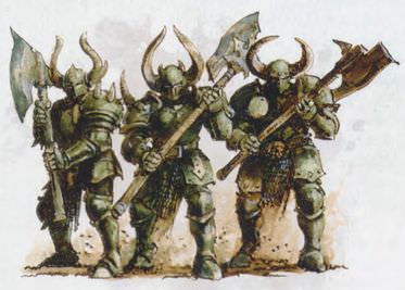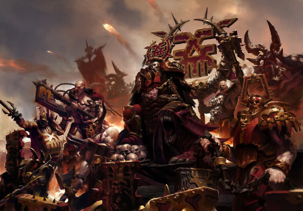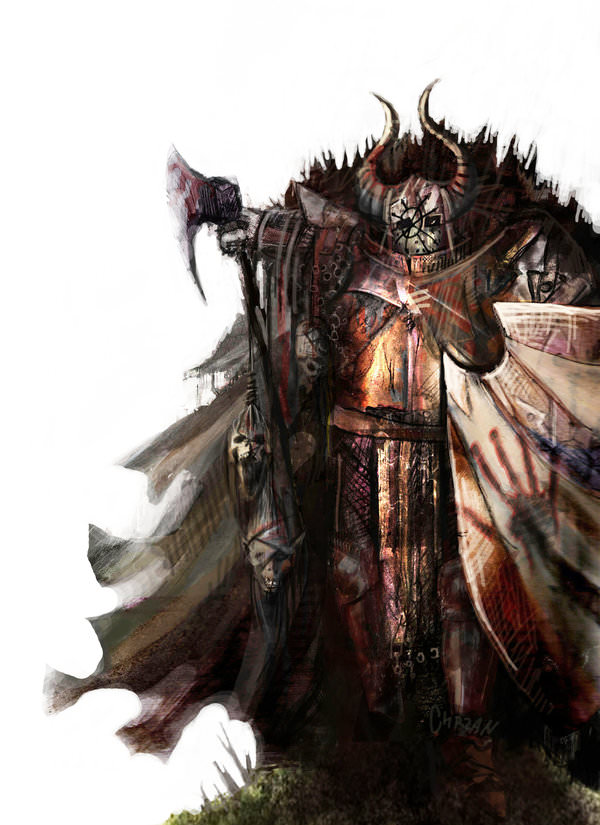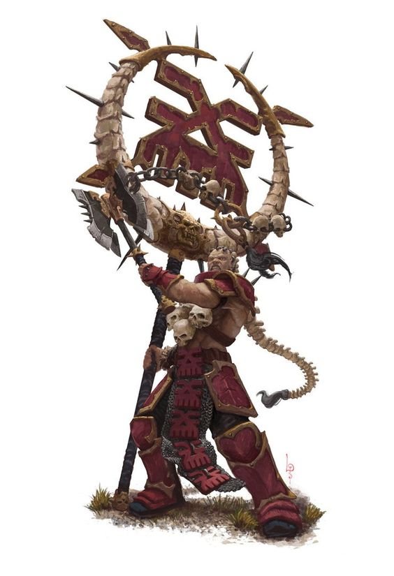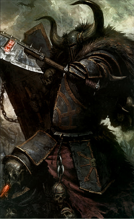 Outside of these tribal hierarchy, warbands of Chaos Warriors are usually united under the ruthless banner of a particularly powerful Chaos Warrior, known as Champions. These Champions are naturally the strongest and most powerful individual within the warband and often bear stigma of the Dark Gods favor. These Champions often in turn, follow the command of an even more powerful Chaos Champion known as Chaos Lords, either out of admiration for his power and skill or by being forced into the ranks after being beaten into submission. The motives and ambitions of these Champions are widely diverse, but the most common goal is simply to gain more power and obtain the highest favor of the gods through acts of conquest.