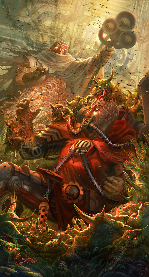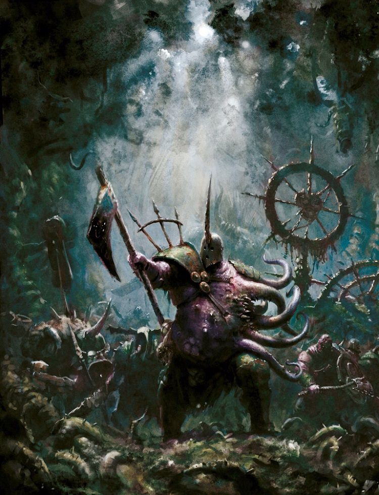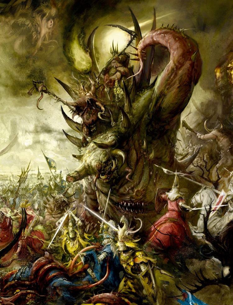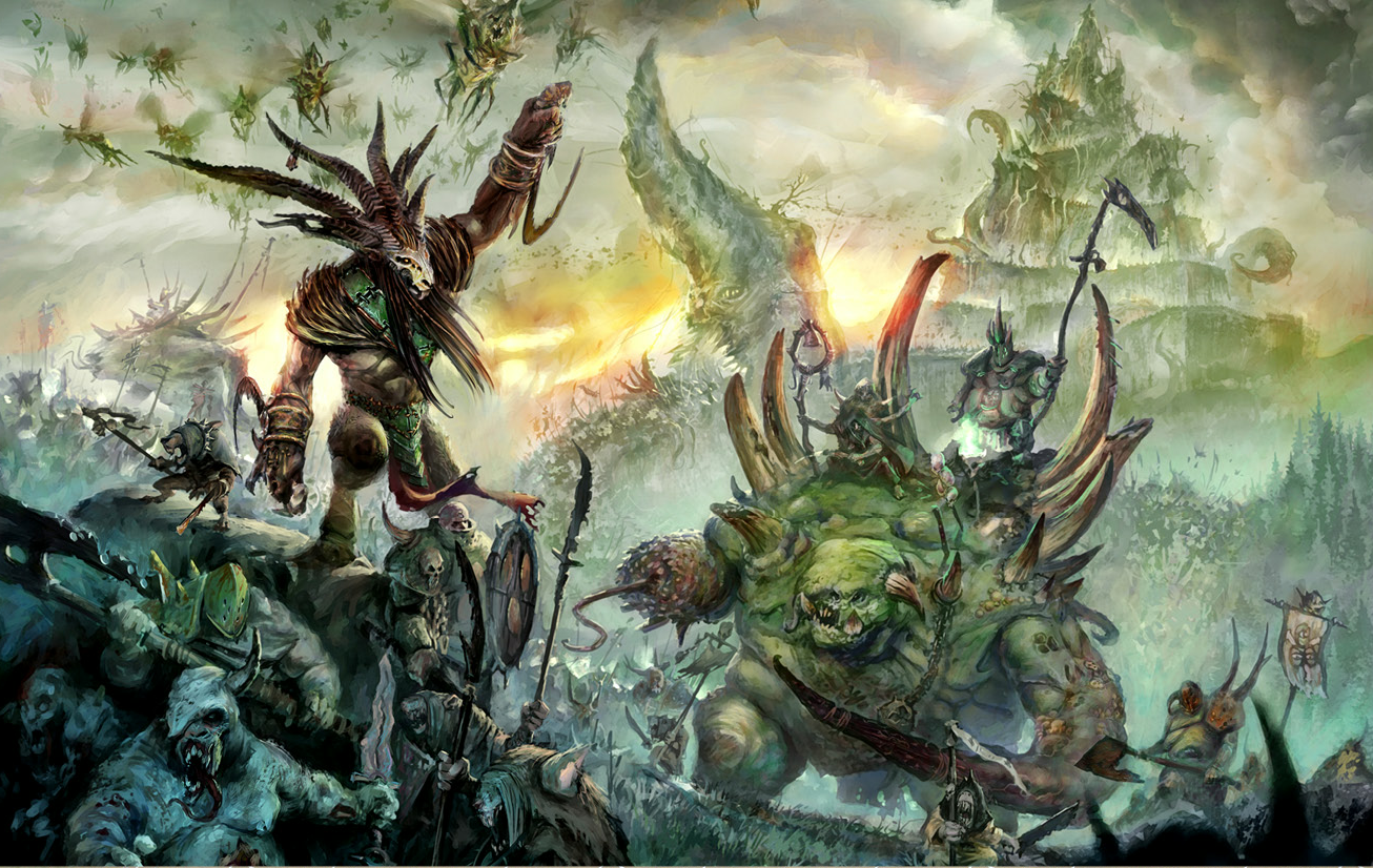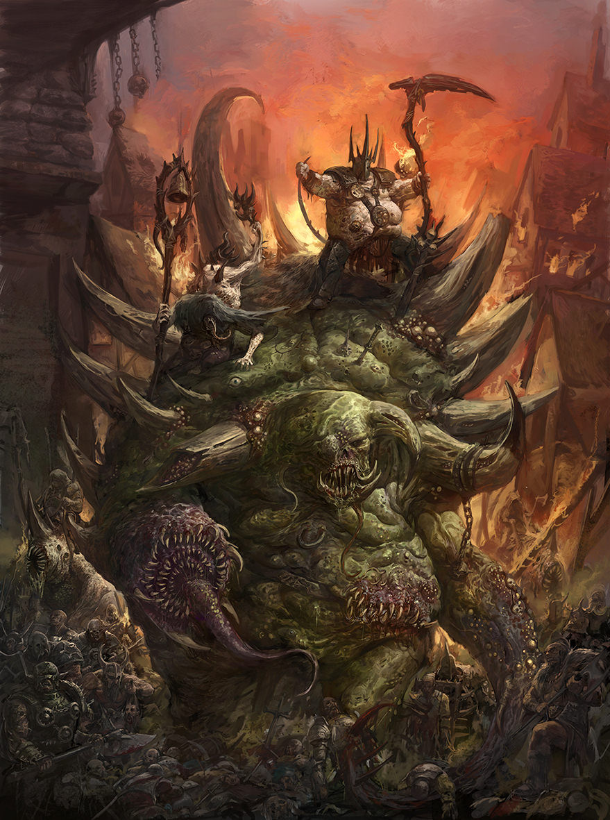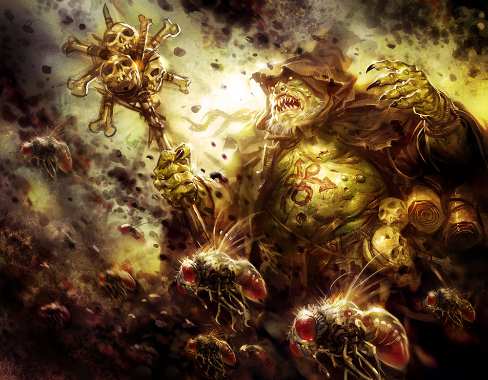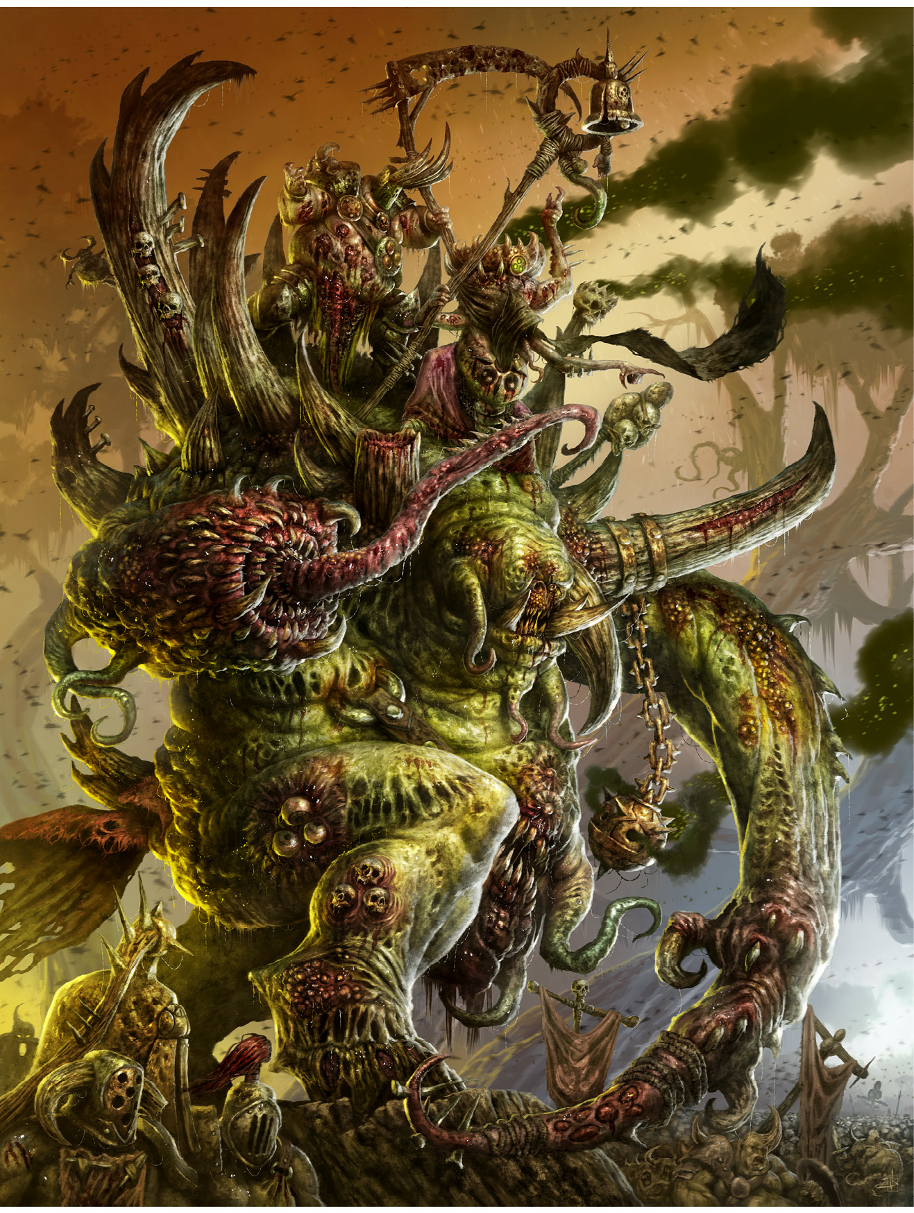 Nurgle. The Plague Lord is the Chaos god of disease, destruction, decay, and Death. His titles include the Fly Lord, Great Corruptor, Master of Pestilence, Lord of Decay (the translation of his Dark Tongue name, Nurgh-leth) and represents morbidity, disease and physical corruption. He is described as a huge, fat, pox infected creature with antlers, and a grotesque body. He is considered the most "friendly" of the chaos gods, for he is the only god to care about those who follow and worship him. His personality is considered joyful, kind, and happy in demeanor. His main enemy is Tzeentch, the Lord of Change, because their power comes from opposing sources. Tzeentch is hope and ambition, while Nurgle is defiance born of despair and hopelessness. Nurgle embodies mortals' desire to elude death, and to live.