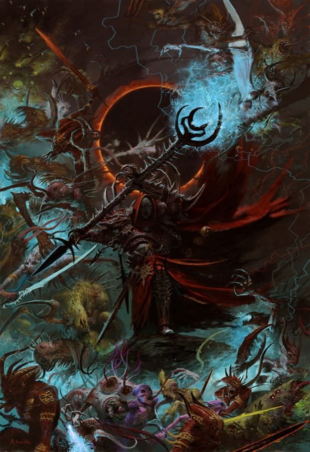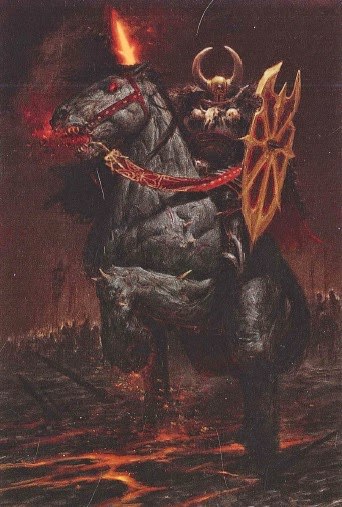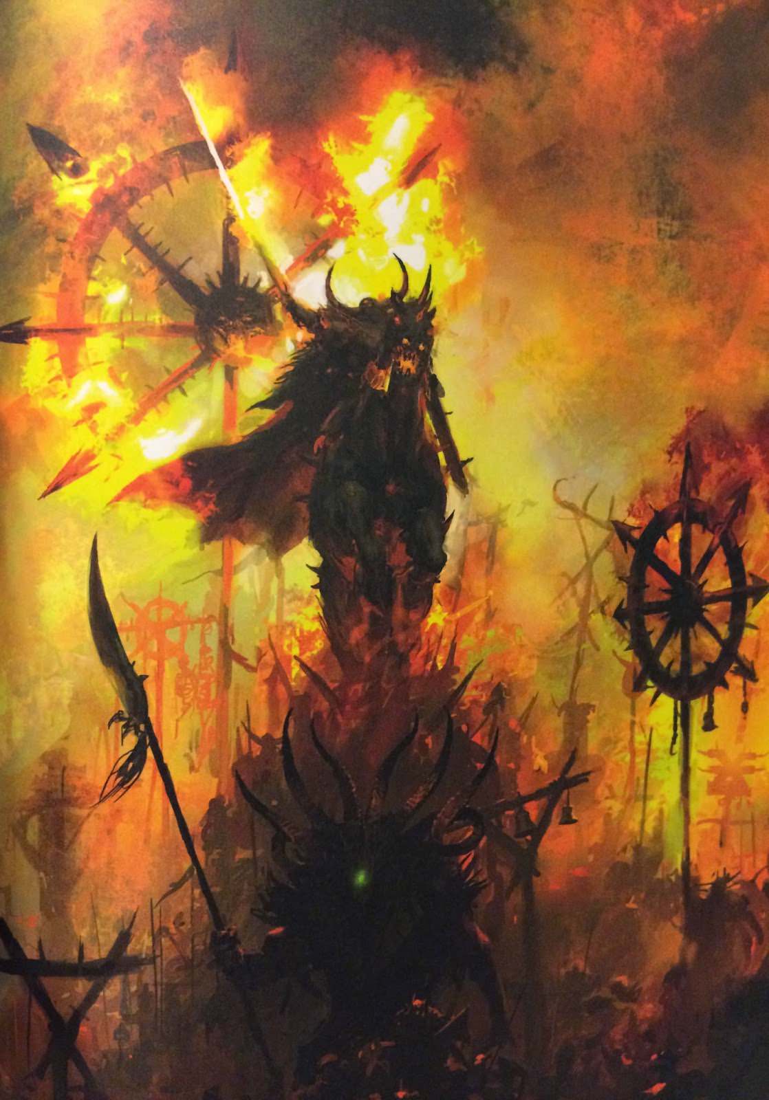 Having at last disarmed the God King, Archaon readied his demonblade for the blow that would kill a god. The intervention of Ulric, Sigmar’s own deity in mortal life, who sought to repay the Everchosen for the despoiling of Middenheim and the slaughter of his worshipers, bought the God King time to recover as the Everchosen finally slew the host of Ulric’s godspark and thus snuff out the last embers of that noble deity’s life.