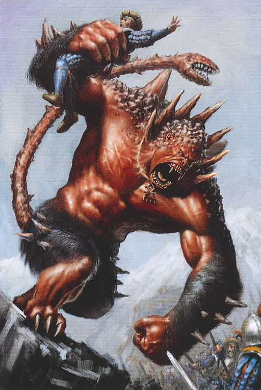 Ungrim vs Scyla. Ungrim Ironfist had held alongside his favored warriors thus far, though now it seemed his doom had come. Scyla Anfingrimm, Talon of Khorne, had followed his slaughterer's instincts to the Magnusspitze, and the truest savages of Archaon's hird had followed in his murderous wake. Axe wielding savages, neither fully men nor daemons, who sought to drown out their own internal agonies with the death cries of their foes: forsaken warriors who had long been cast aside from the shifting gaze of the gods and set upon the path of death or spawndom. Where the Dwarfs had managed to hold back the rest of the Norscan horde; there was no way to contain Scyla's howling host. With tendril, pinion and snapping claw, the Bloodbeasts crushed the slayers under their mindless, bestial bloodlust.
