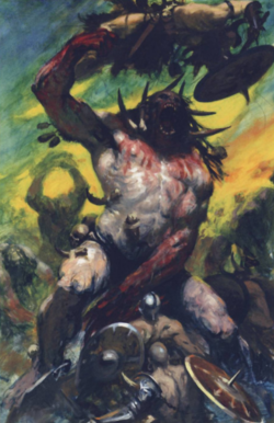 Scyla at last had found Ungrim on the field of battle and matched his mighty claw against the Axe of Dargo. The Slayer King was buttressed by a ancient power; the very Wind of Aqshy itself, which strengthened his limbs and guided his blows, cloaked itself about him and burned away the darkness. But Scyla was amongst the Blood God's most beloved warriors, and in the Final Days of the world, he had grown mighty indeed. Insensate to the pain of the magical fires Ungrim now conjured, the Chaos Spawn bore down upon him earth shattering blows and pulverized his armor. Once, twice, thrice, the former Norse champion had used Ungrim as an improvised flail, using the king to crush and shatter his very subjects. When Scyla drew the battered Dwarf back for a fourth time, it was then that Ungrim let fly his final, desperate swing.