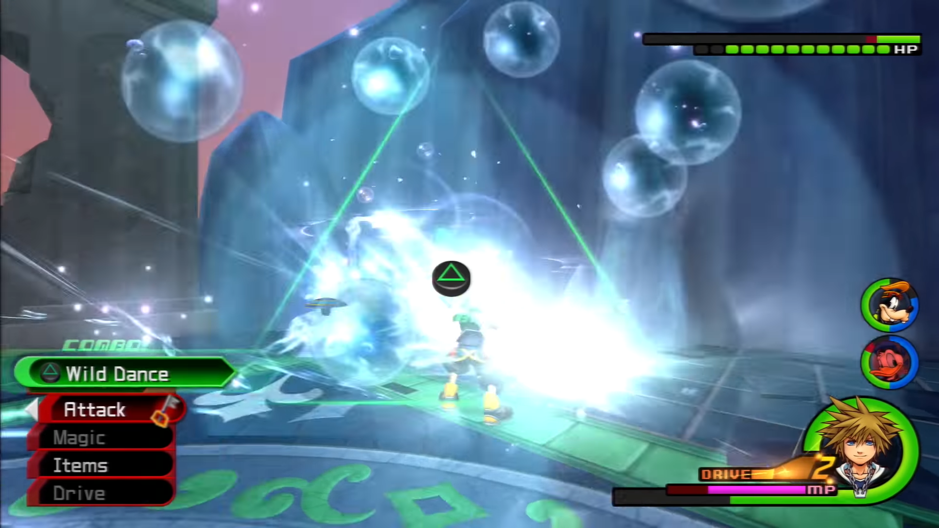 Criss-Cross (Two Actions) Roxas imbues his swords with magic and light releasing a horizontal slash around himself.