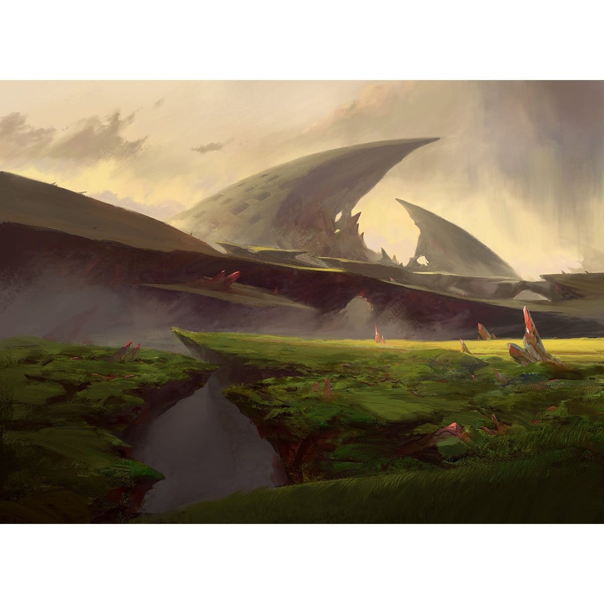 Located on the lush plain of Egali in the lowlands of Savai, Drannith was the largest city on the plane of Ikoria, a human sanctuary with tens of thousands of residents. It was destroyed by Lukka during New Phyrexia's Invasion of the Multiverse. Now a ruin, its survivors fled to nearby Lavabrink. Hunters and bonders often travel to the ruins to retrieve precious belongings left behind during the invasion.