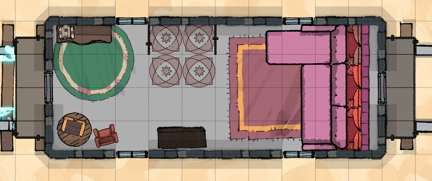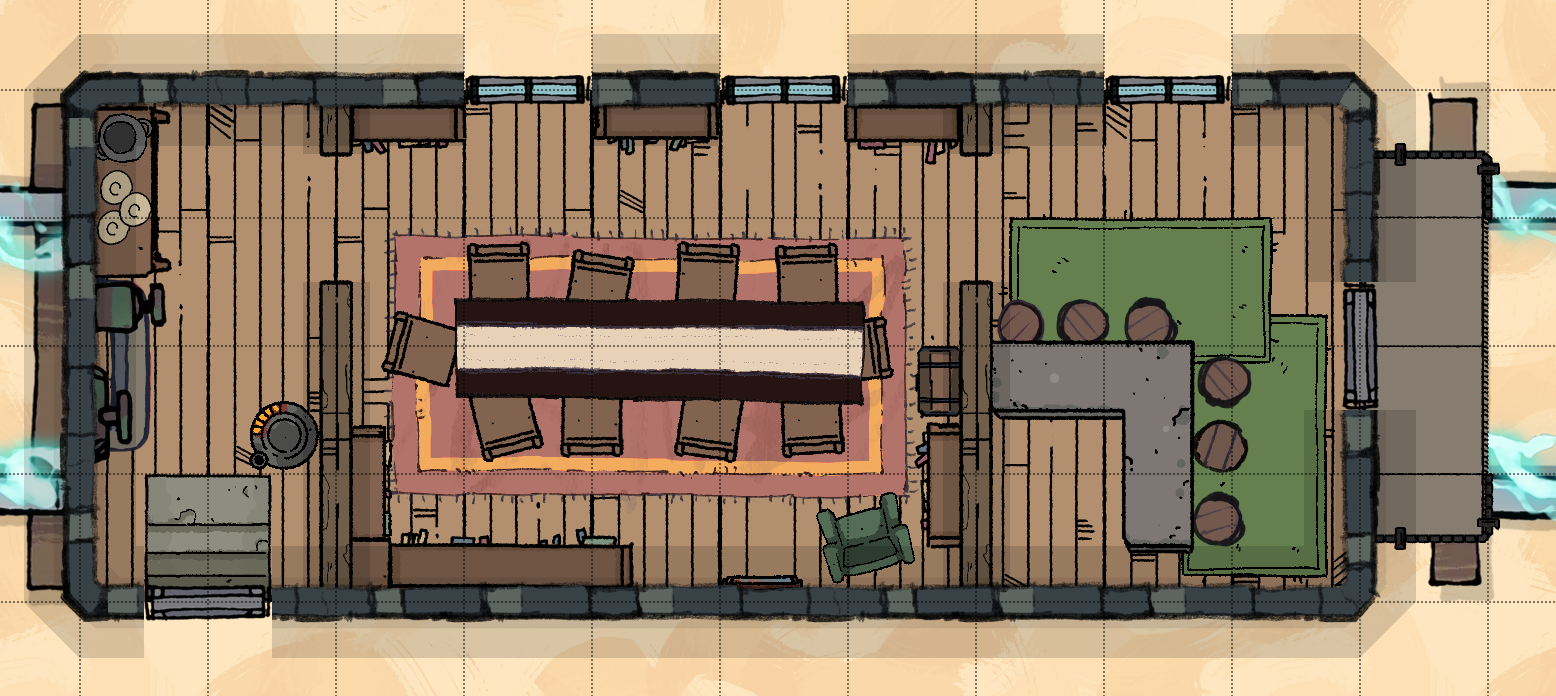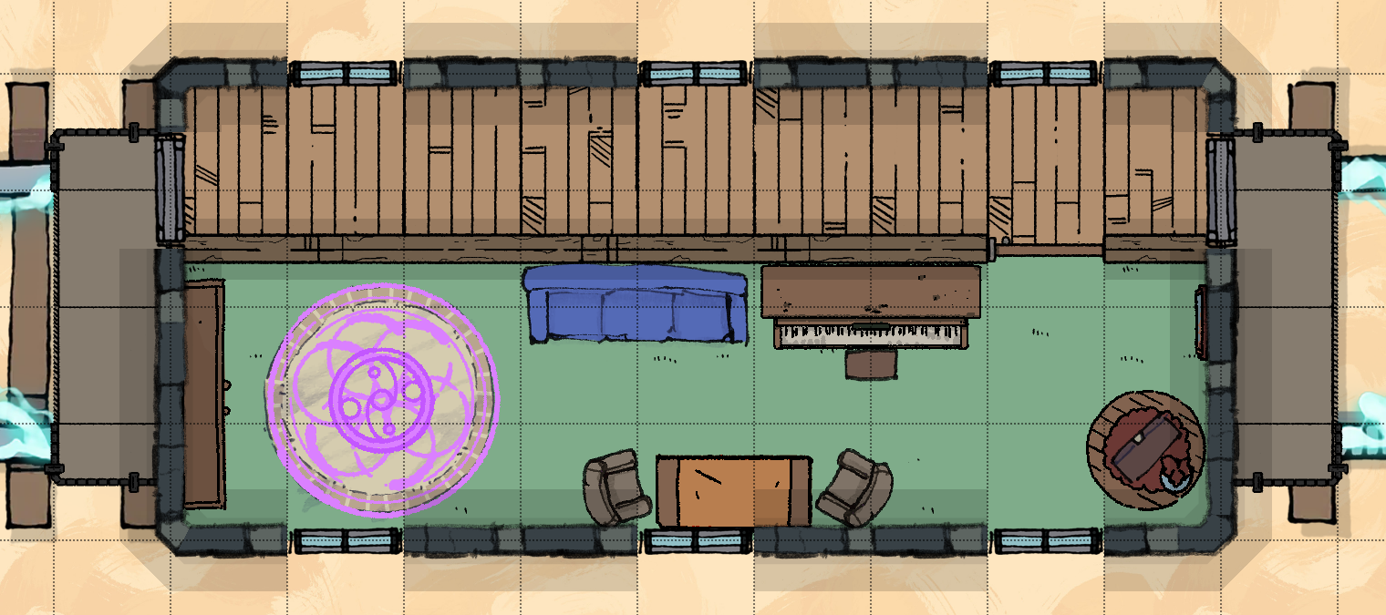 After determining there is no more available information (and leaving initiative order) the guests will settle into the spaces they will inhabit for the remainder of the trip - Charlie in the bar area of the dining car, Johann Argent beginning his ritual in the parlor car, and Tivan Baldero at the desk in the study.