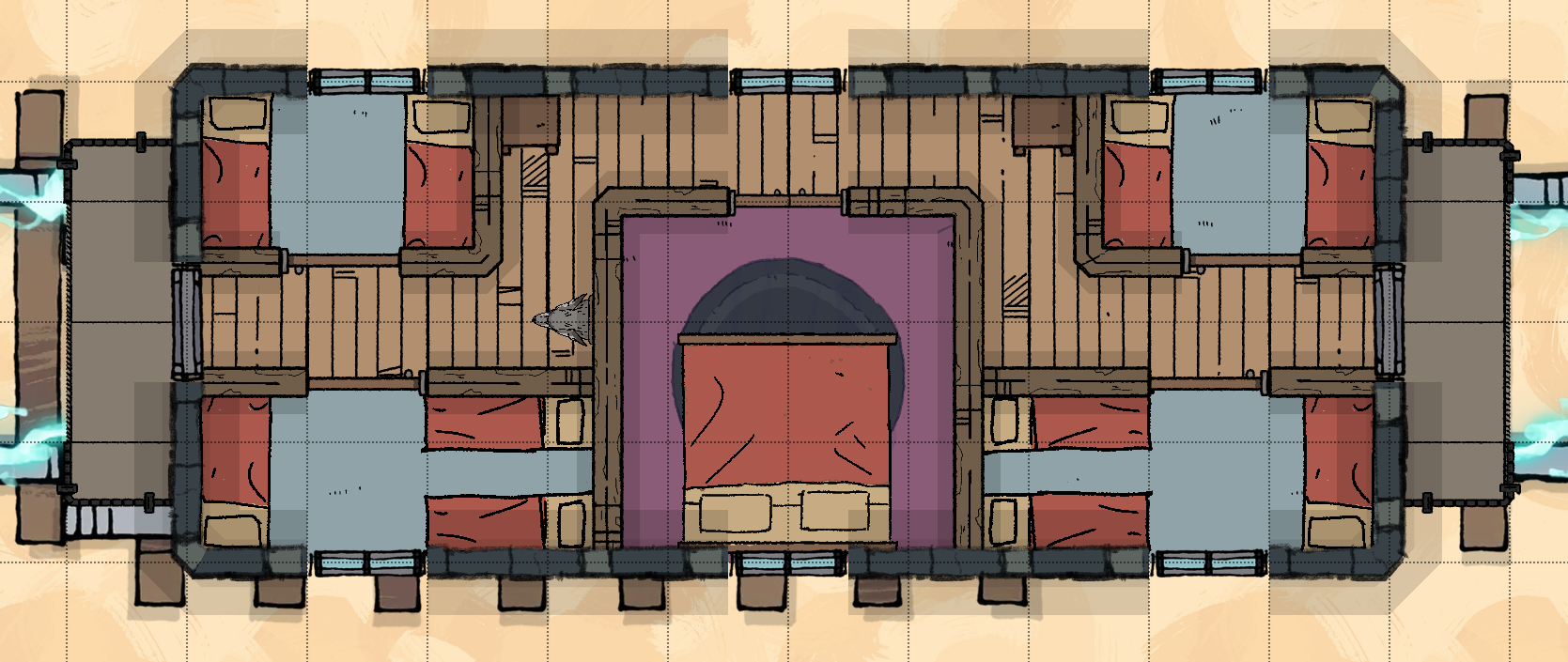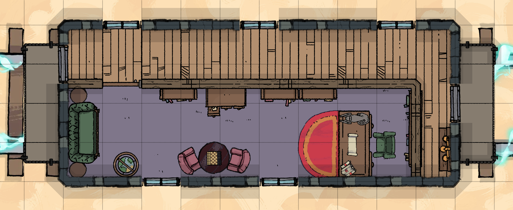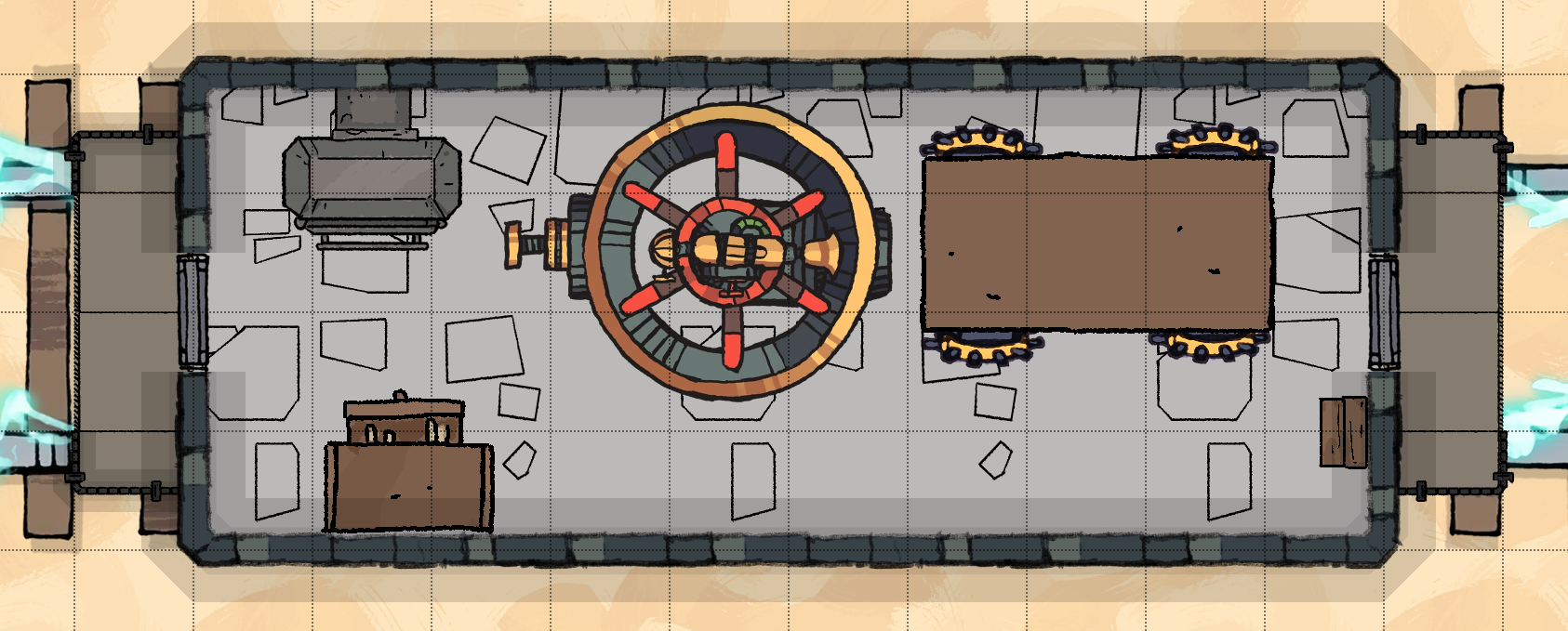 Alternatively, enterprising adventurers may choose to circumvent the doors by climbing over the train car rooves (requiring a DC 15 Strength (Athletics) or Dexterity (Acrobatics) check to avoid falling off) or by flying. The Lab and Caboose doors are unlocked, but the back door of the Study Car must be unlocked via the scales.