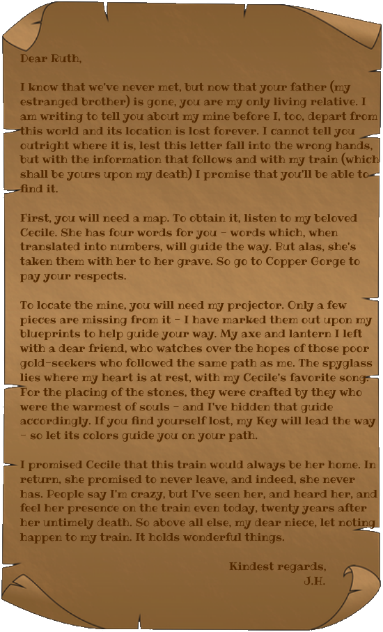 Alternatively, this adventure can be run without the presence of the NPCs, with the party acquiring the letter and/or the train and seeking after this treasure themself.
