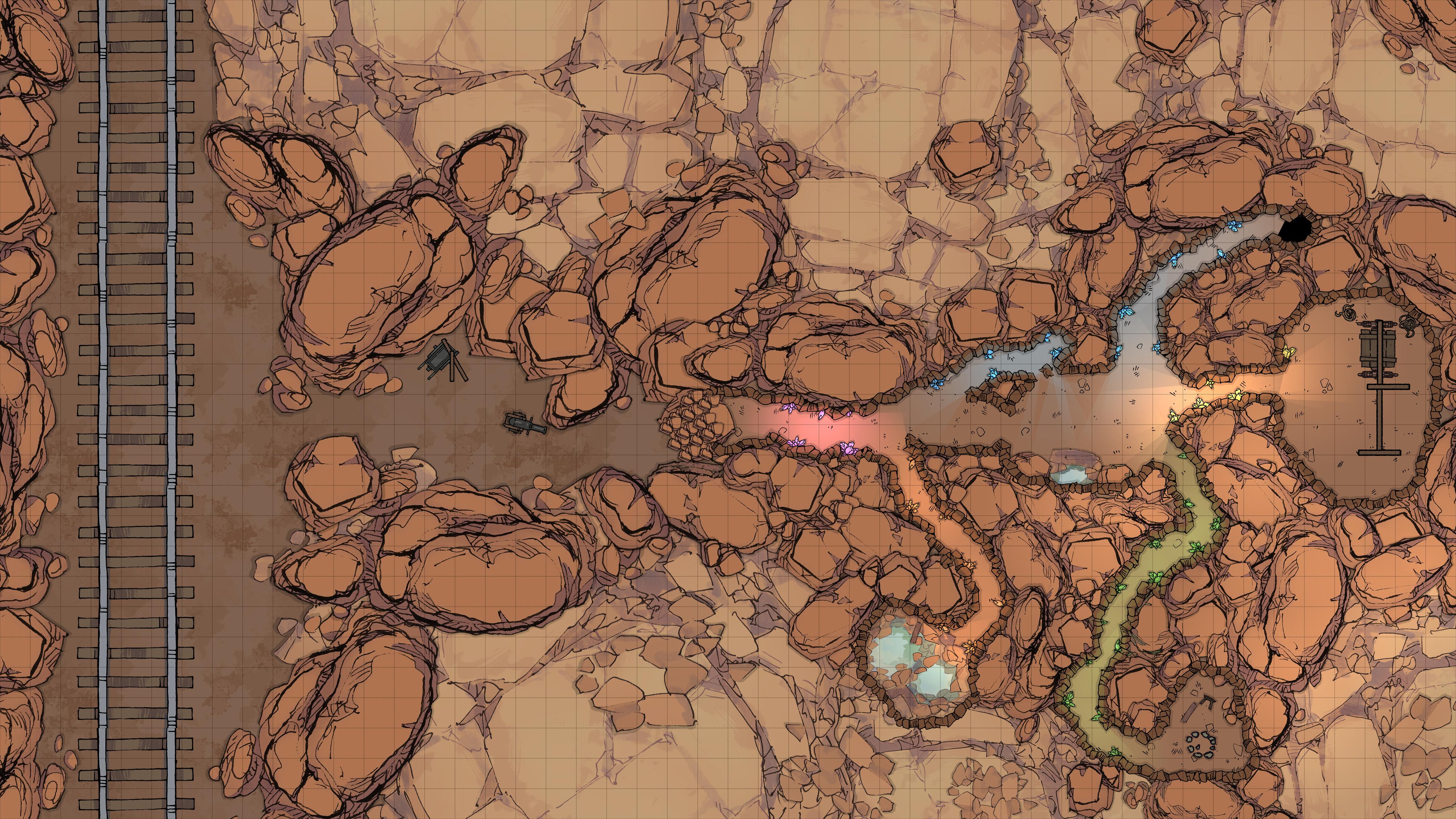 Stepping onwards, through the rocks, you find yourselves in a small clearing. While mostly empty, there are the signs someone has been here before, an old cart and some scattered mining supplies, and an iron cannon. At the end of this clearing, you see a large pile of rubble - what seems to have once been an entrance, but has now caved in.