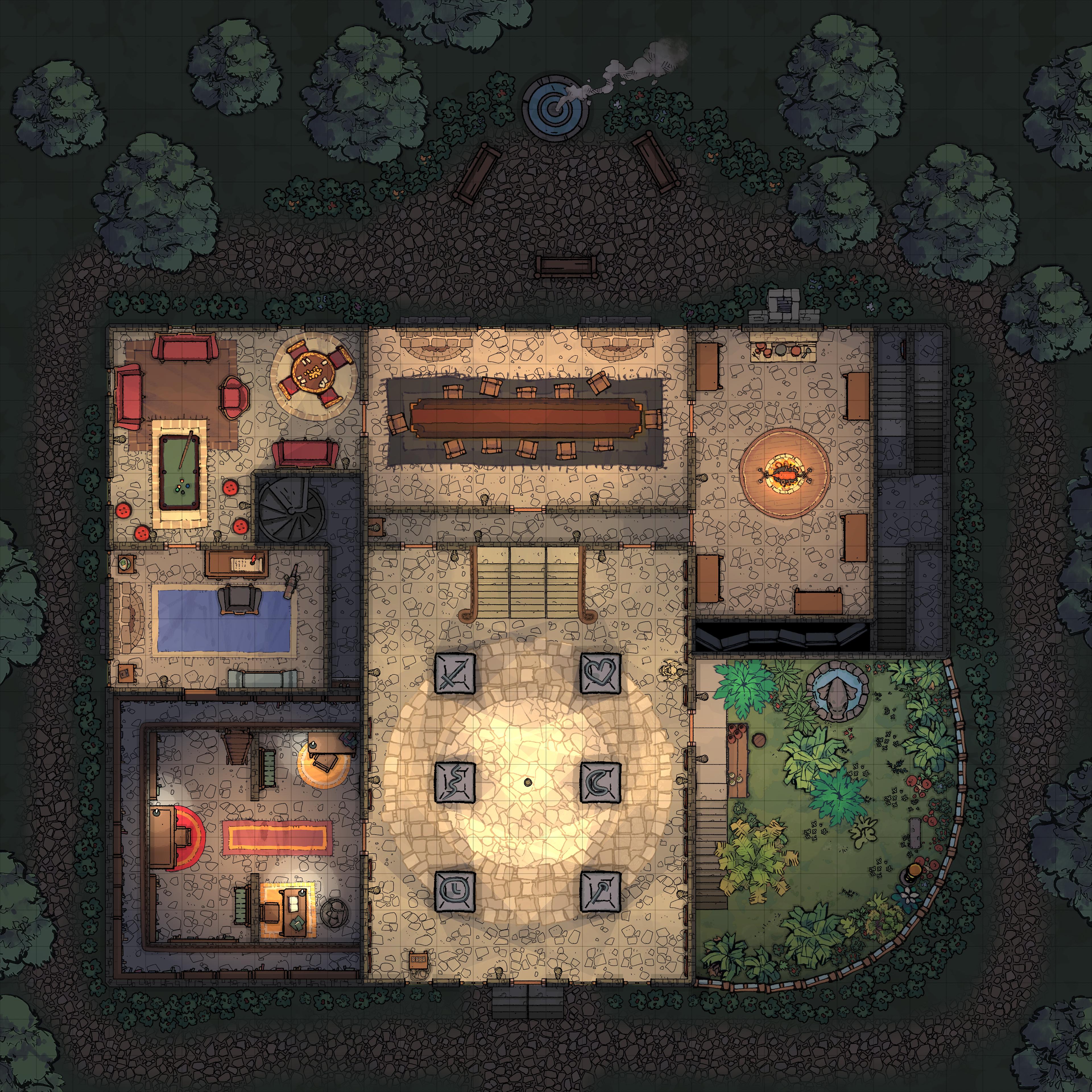Traps may be added to the Abandoned Estate, both intentional on doors to certain areas, or unintentional, such as decayed flooring in the upstairs hall. The conservatory is liable for poisonous plants with area effects, and various molds/environmental hazards outlined in the DMG may be placed in the Library, Kitchens, and halls to create a more decrepit feel.