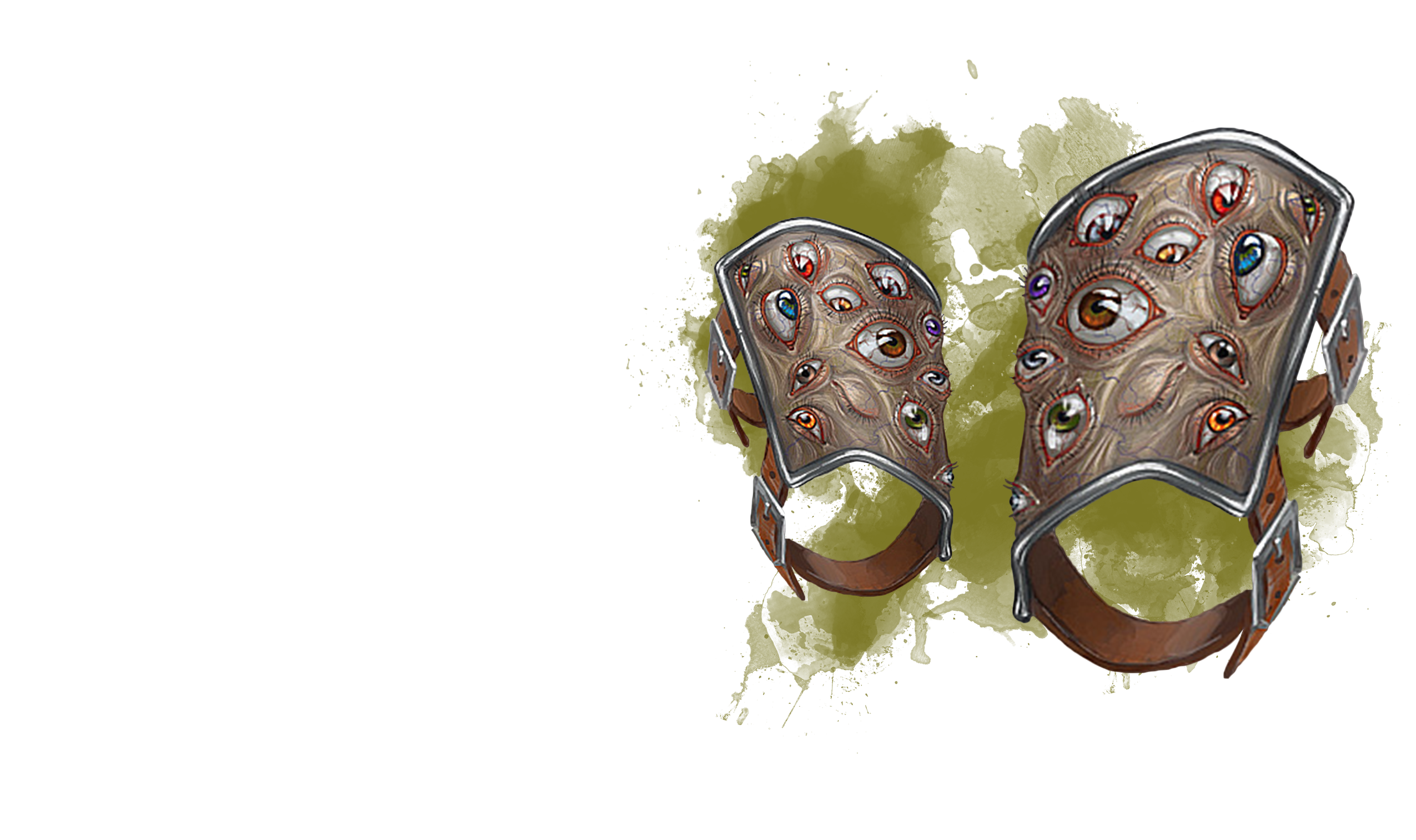 The wielder of these horrendous bracers can use the many eyes embedded on them as though they are the wielder's own. While wearing these bracers, and while they are not covered by an object, you gain the following benefits: