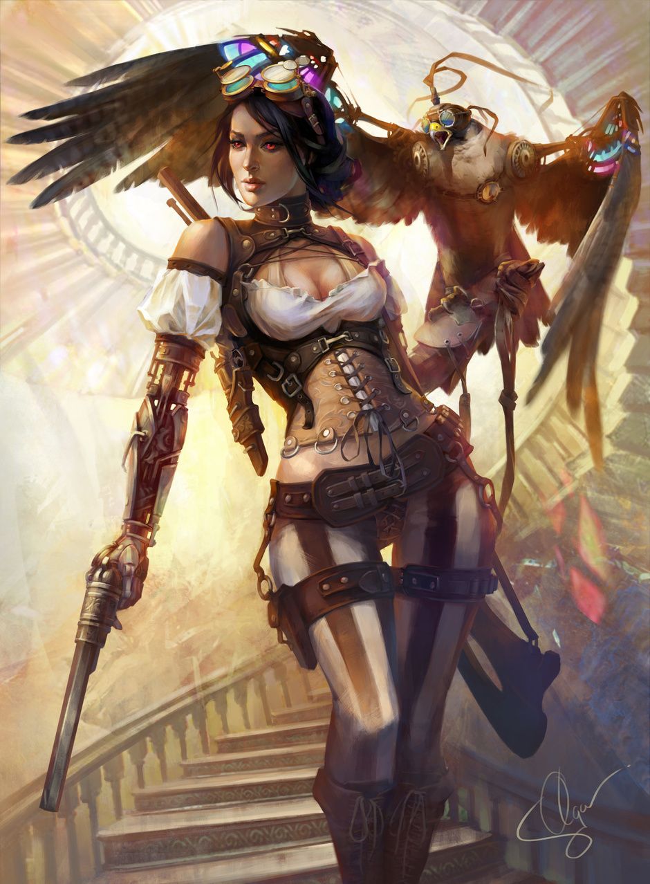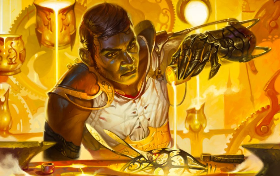 This gauntlet is affixed with a series of inscribed runic cogs, gears, sprockets, and tubes that tick harmoniously within one another and show a clock-like display. The display shows the current time of day and relative elevation (in relation to sea level) of the wearer, and functions as both an abacus for calculations and a compass.