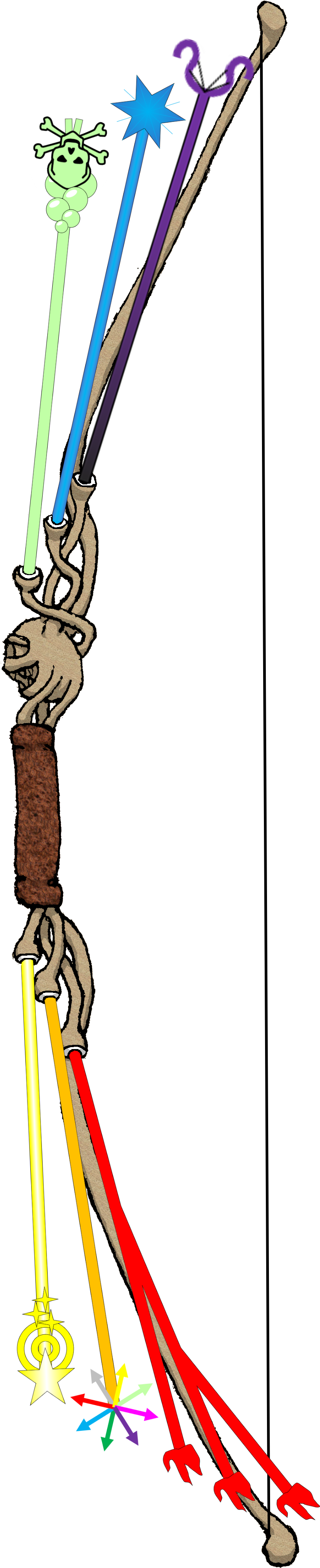 Six arrows (rayrrows) sprout from the colored eyes on this magical bow. As an action, you can withdraw and shoot one of these arrows, which becomes a magical ray as you fire it. If it normally requires an attack roll when cast as a spell, it uses the attack roll you used to fire it; if it normally only requires a saving throw(s), you must still hit the target with your attack roll for the magic to take effect, and if you do the target has disadvantage on the first saving throw forced by the spell. If the spell requires a saving throw the DC equals 8 + your proficiency bonus + your dexterity modifier. Rayrrows do not add your dexterity modifier to their damage. Each shot uses the raynbow's weapon range instead of the corresponding spell's range. A withdrawn rayrrow vanishes at the end of the turn it's withdrawn if it isn't fired.