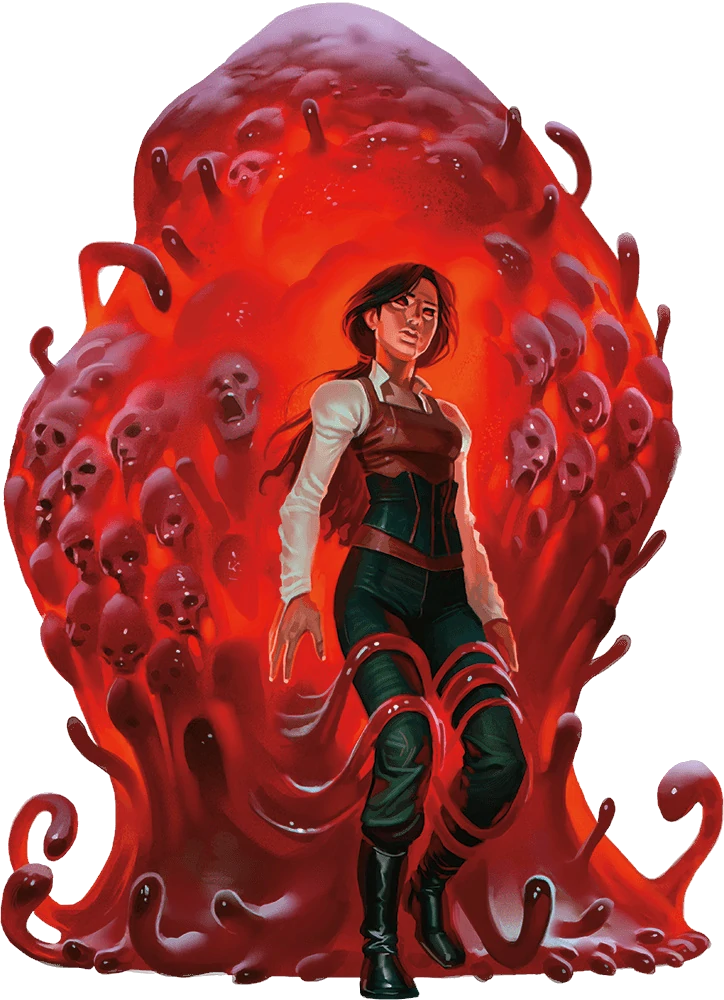 Outside a host body, a blood-borne ooze resembles a gelatinous pool of blood mixed with other bodily ichor. The ooze’s ability to permeate skin—living or dead— allows them to infect unsuspecting mourners, coroners, gravediggers, or other individuals who frequent cemeteries.