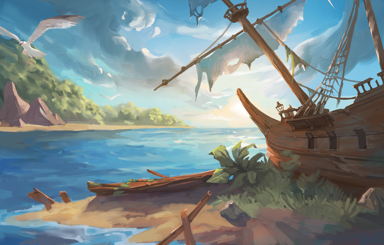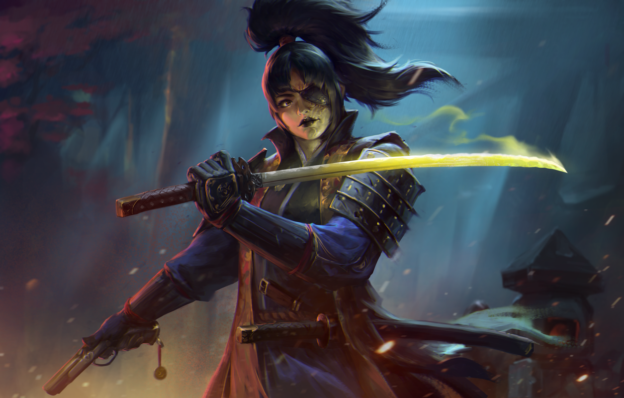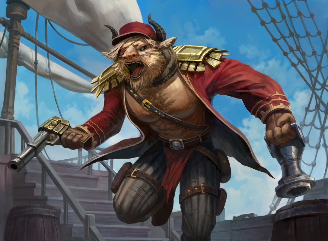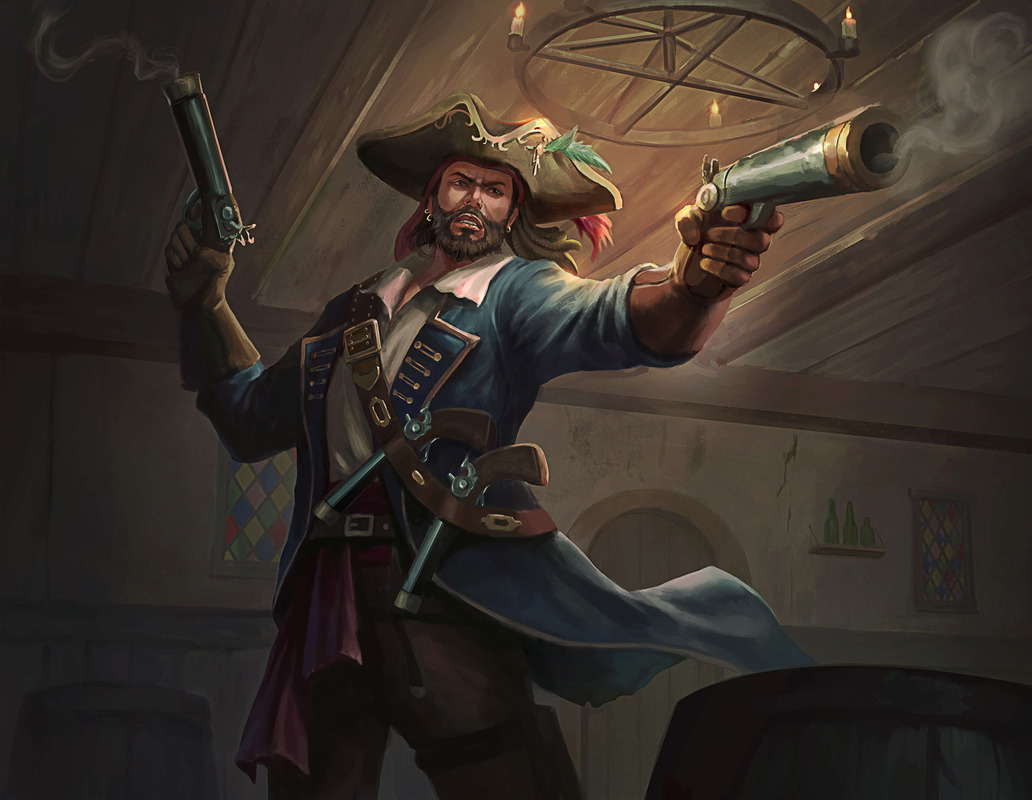 A pistol-wielding pirate swings over the railing, a curved knife clutched in her teeth. The rope swings back behind her as she lands on the deck, guns booming, and ducks underneath a savage cutlass swing. Her first shot downs one foe; her second catches the enemy captain in the shoulder, though he stays standing and levels his own hand cannon. But her shot is faster - tossing her pistol the deck, she whips a spare from her brace and drills a lead ball straight through the man's heart.