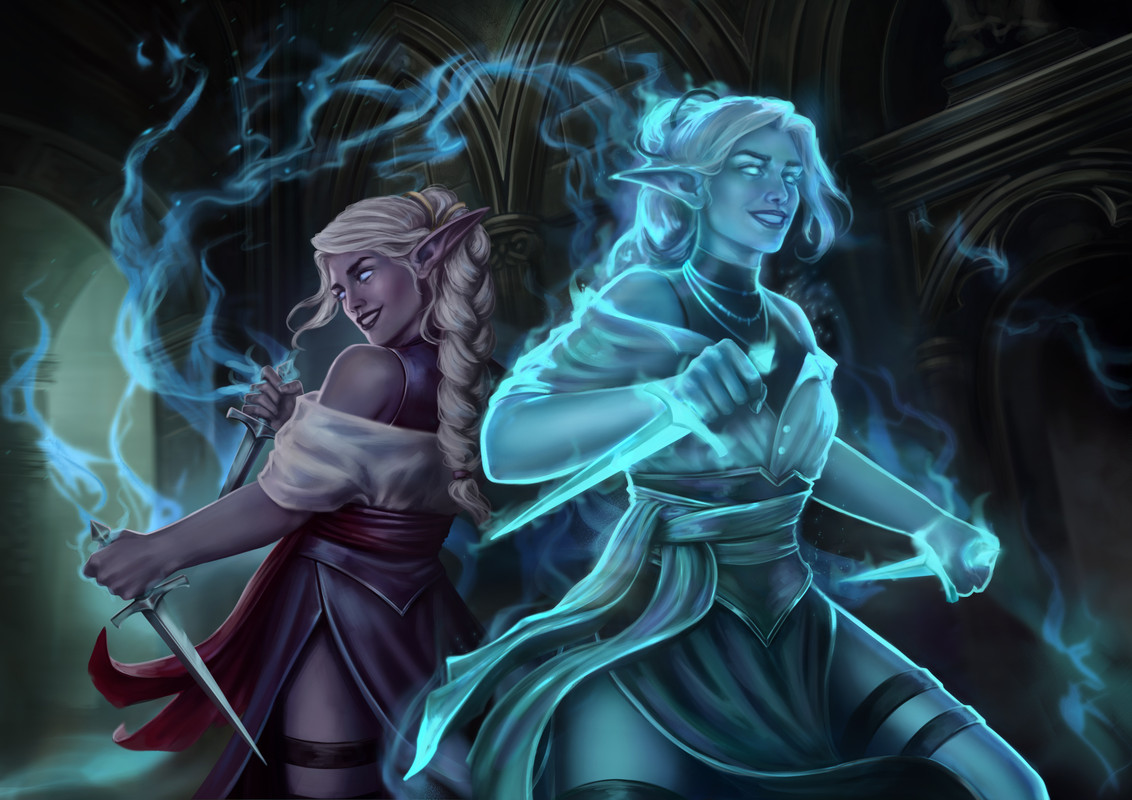 An elegant woman in practical but stylish garb glances around the corner, waiting for the sound of her teammate's distraction. It never comes. Scowling, she snaps her fingers, then her eyes glow as she intones some magic words and conjures an illusory dragon, soaring over the city. Amid the surprise, she slips past and to the vault entrance, dispatching the guard in a single stab thanks to a hallucinatory spider dropping on him from above.