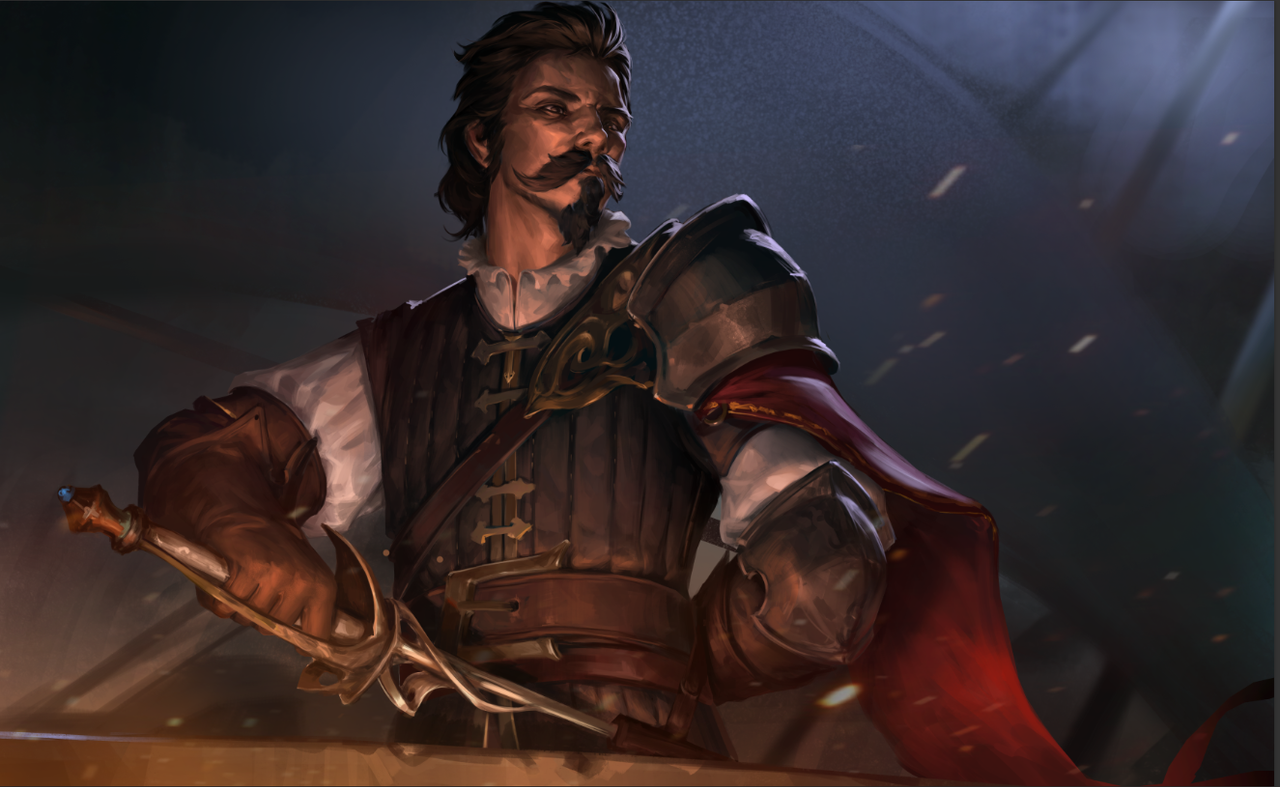 A dashing fencer in a neat leather jerkin stands across the square, rapier held en garde. His neat moustache, waxed to points, is more gray than black; his fearsome reputation has been earned over a lifetime of challenges. As his opponent warily draws a blade, he twirls the blade in his hand, strafing a flash of sunlight across the anxious crowd.