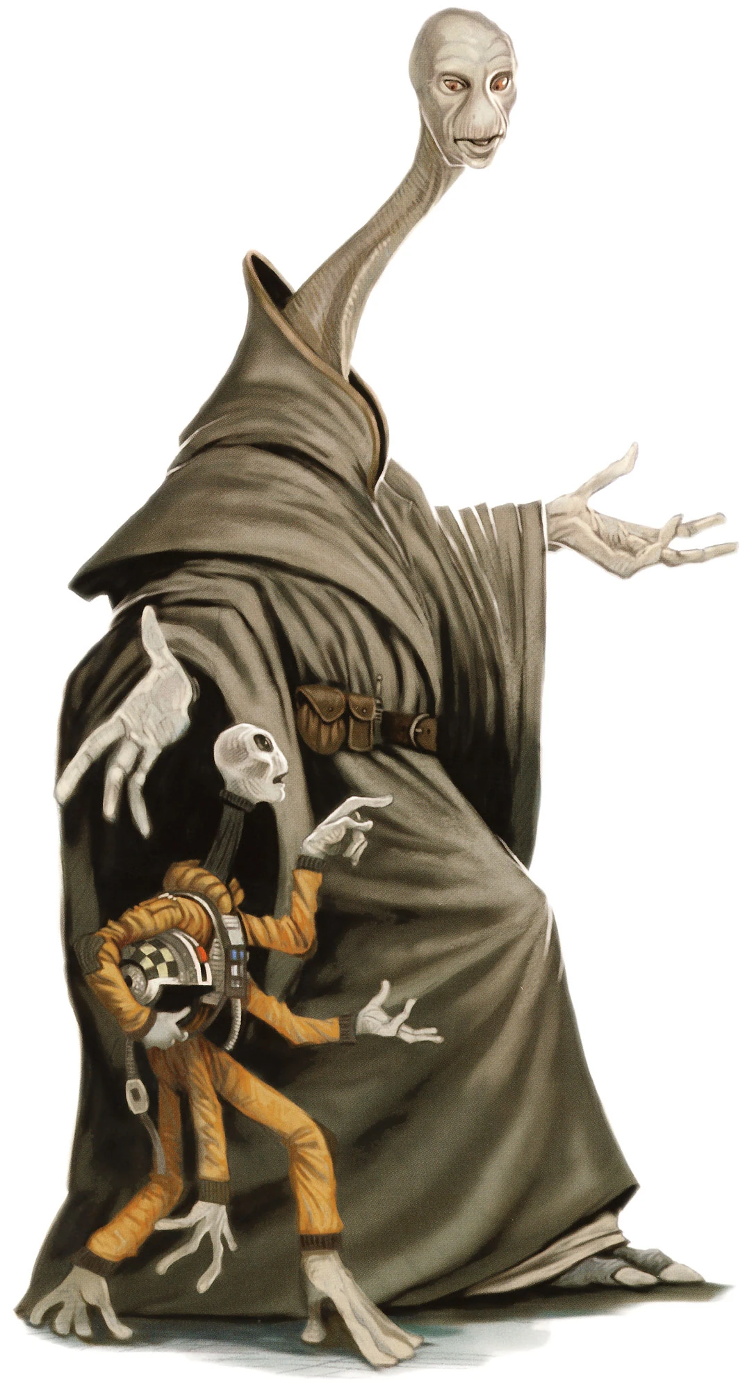 Physically, the Yevetha are tall beings with a ghoulish appearance that is bereft of any body hair, being described as being so gaunt as to seem skeletal due to their pallid gray skin and lithe builds. The species possesses six fingered hands that have retractable dewclaws. Each one is located on the inside of the wrist above their six-fingered hands. Their dewclaws shoot from a sheath of a skin beneath their cadaverous hands and are capable of being retracted. When extended fully, the wrist blades reach about a foot in length, and are used in close combat and blood sacrifices. The Yevetha also possess a greater tolerance for g-forces when compared to Human pilots.