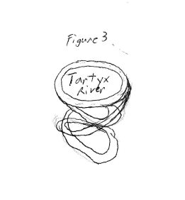 Figure 3 - This shows a rudimentary diagram of the complexity of the Tartyx River, also just known as Tartyx by the natives. Tartyx is the only body of water NOT ruled over by Thassa, and is the sole domain of Athreos. This river, defying normal logic, floats off of the edge of the world. The edge of Theros's ocean just falls off into the void. This river spirals downwards in two locations, with both trails meeting once more before the entrance to the underworld. Tartyx is also a river not meant for living beings, as it strips them of their memories if contact is made.