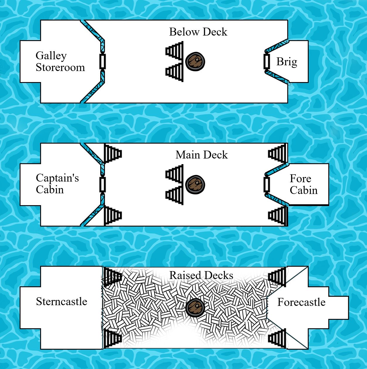 The open deck has two cannons on each side locked into firing position. There is always at least one sailor walking the deck on watch plus one at the helm above the captain’s cabin. During the day there is either a sailor at the fore or in the crow’s nest.Cannon