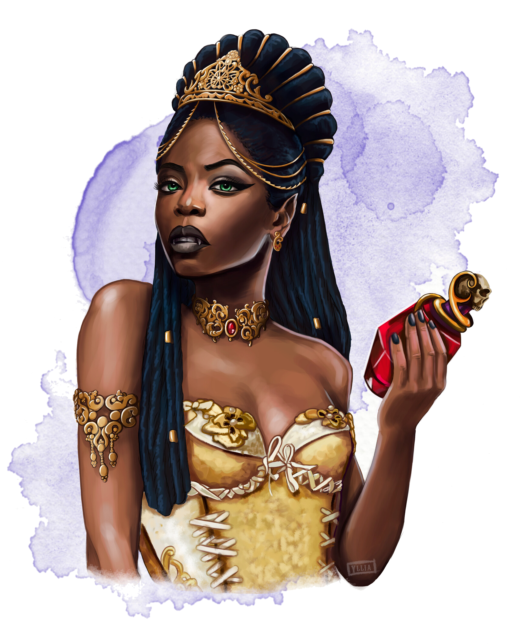 She came to Barovia as a little girl, joining a passing Vistani tribe. She hid in one of the wagons and inadvertently found herself in Strahd’s cursed lands shortly after. She made a living by stealing and hiding in the shadows for years before a kind family in Vallaki adopted her. Her life with her family was better than life on the streets, but because of the color of her skin she was made to feel different, and by the time she was 18 she felt more like an outcast than ever. She set out to investigate the Amber temple one night soon after and ran into the dusk elf Rahadin on one of his trips to petition the dark powers. He perceived the beautiful young girl would provide Strahd an exotic distraction, which she did.