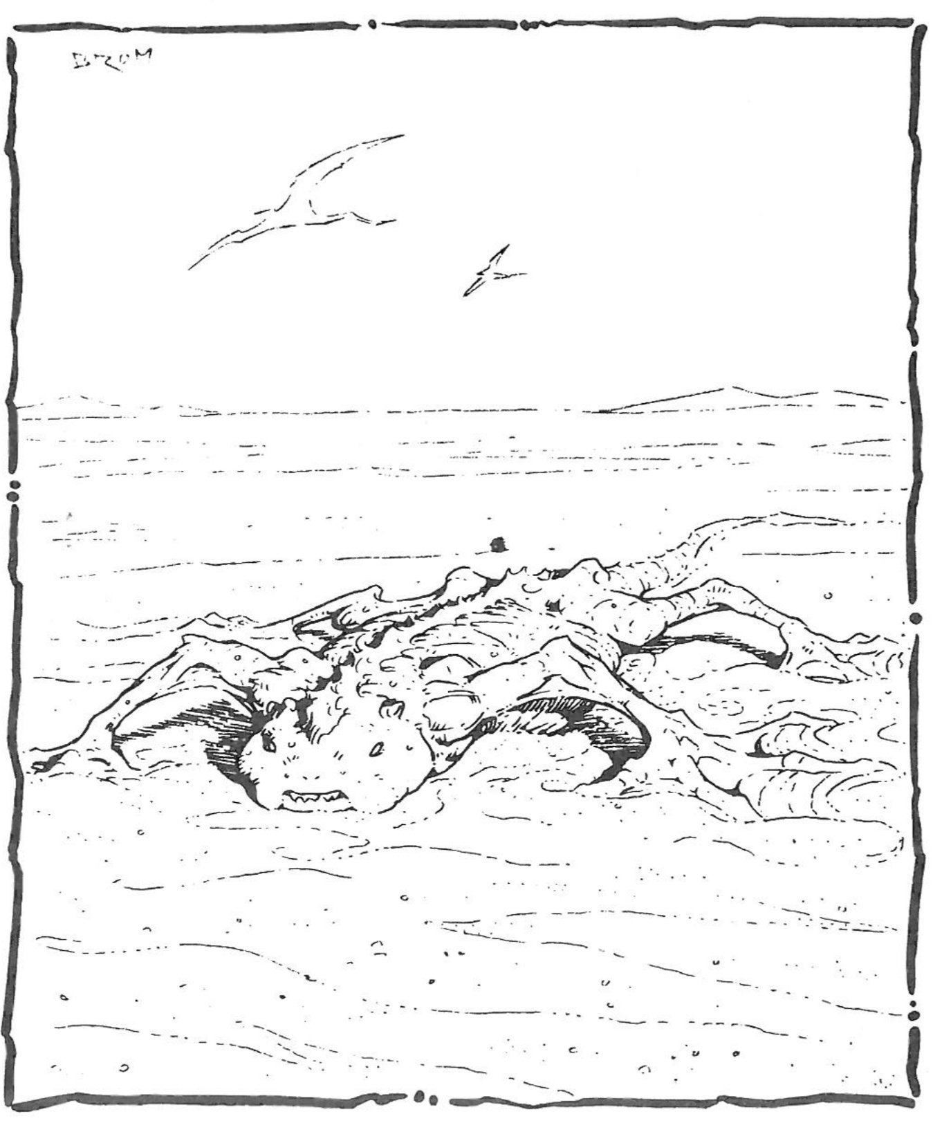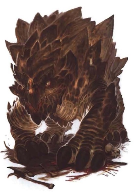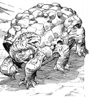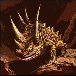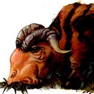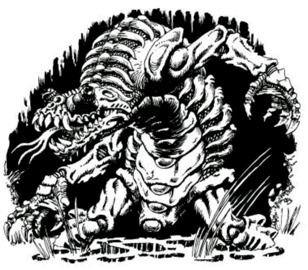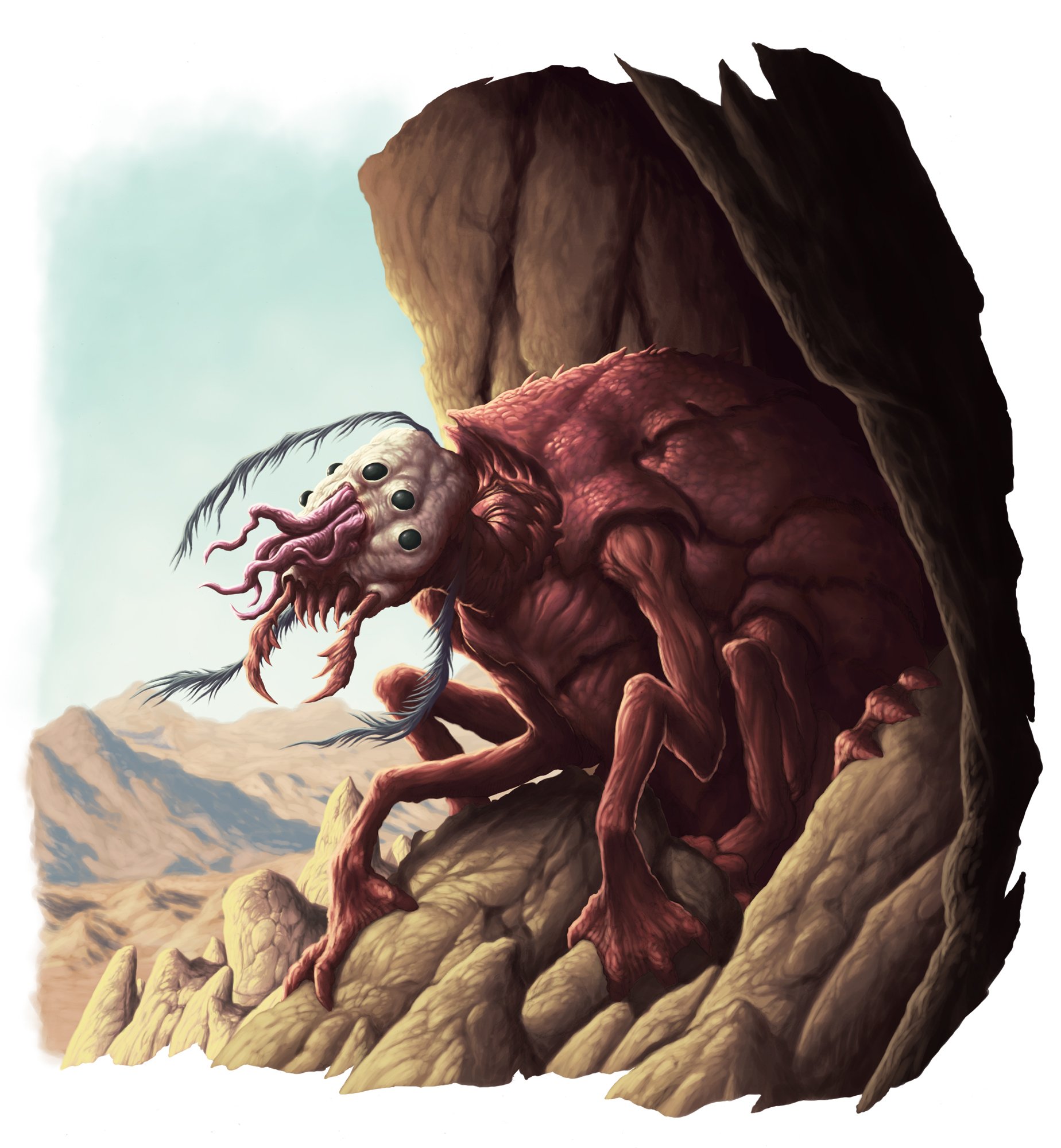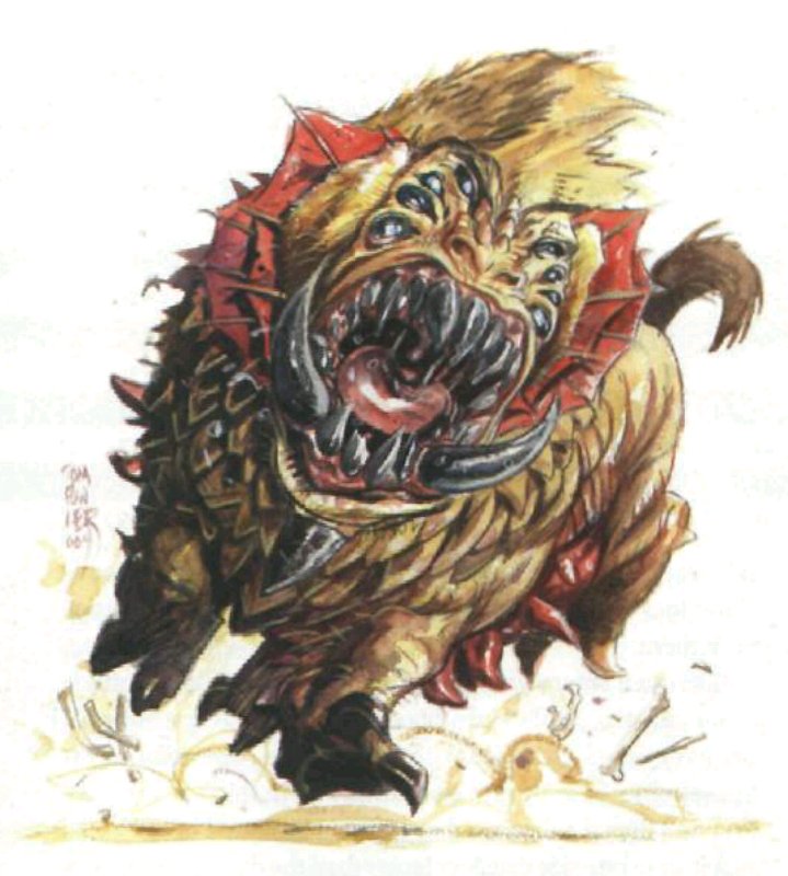 In the broken crags and tiny caves of the barrens lives the timid baazrag. Two feet long or less, it is one of the smallest omnivores in the stony barren regions. The baazrag’ s face is protected by a bony covering that reaches down on either side of the head and across the nose, with holes for the creature’s nostrils and eyes. The mouth and lower jaw are not protected below the bony covering. The beast’s humped back is covered with a hard, natural armor that protects the animal, especially the fluid storage sack just beneath the shell. Its four legs are comparatively frail but are adequate for darting from shelter to shelter around its rocky home.