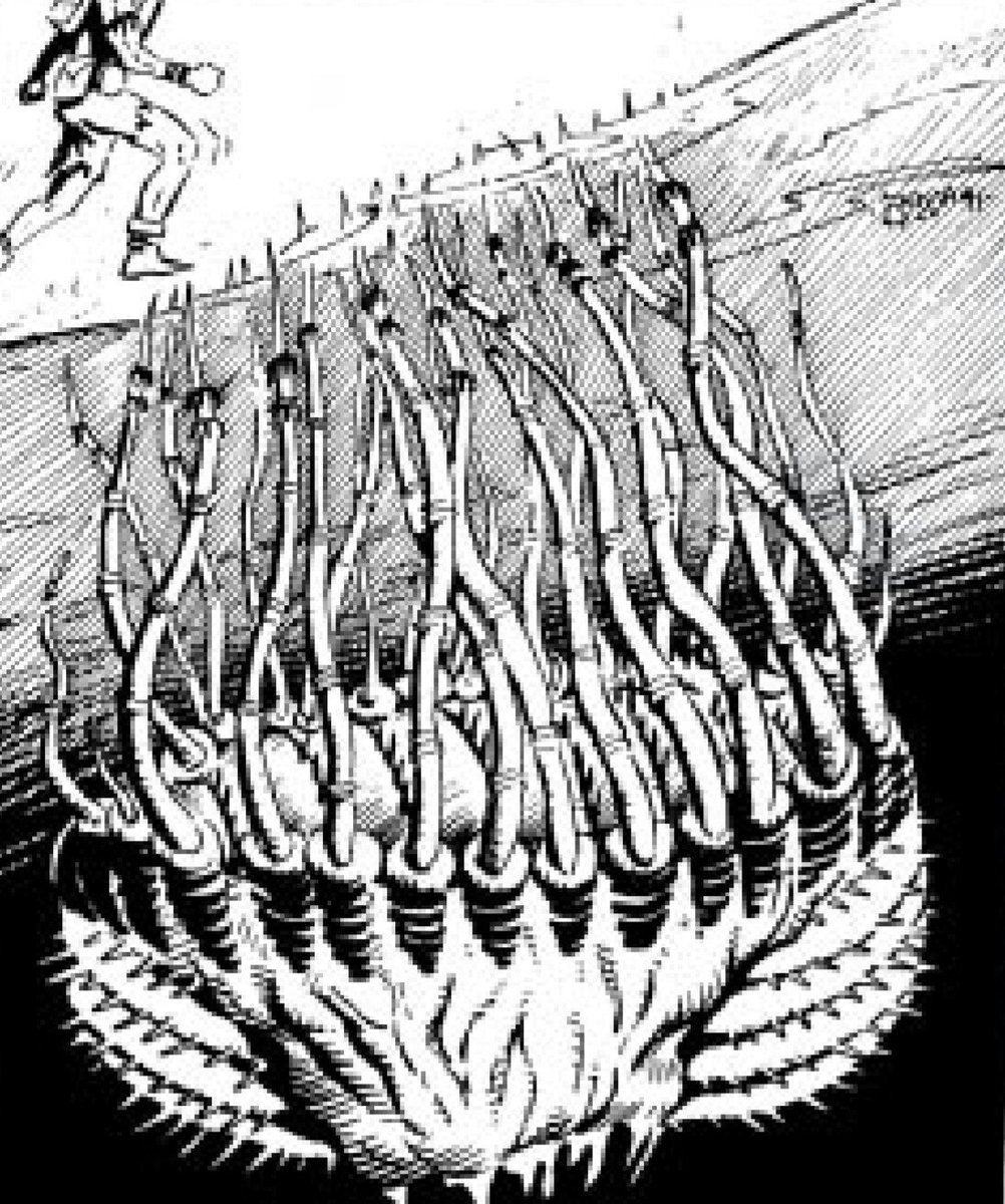 Each antloid worker spends its entire life doing one specific job: finding and carrying water and food back to the warrens, caring for the queen, repairing, and making additions to the warren, etc. Solely responsible for the warrens, worker antloids can consume sand and then regurgitate it as a strong, brick-like substance that forms the walls of the warren. Worker antloids have three easily defined, sapphire-blue body segments that reach about eight feet in total length.
