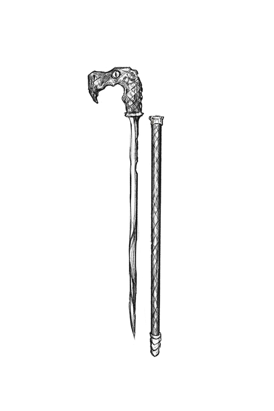 Hidden in Plain Sight. When sheathed, the weapon resemble a simple walking cane. To unlock the weapon, a specific movement with the handle must be realized.