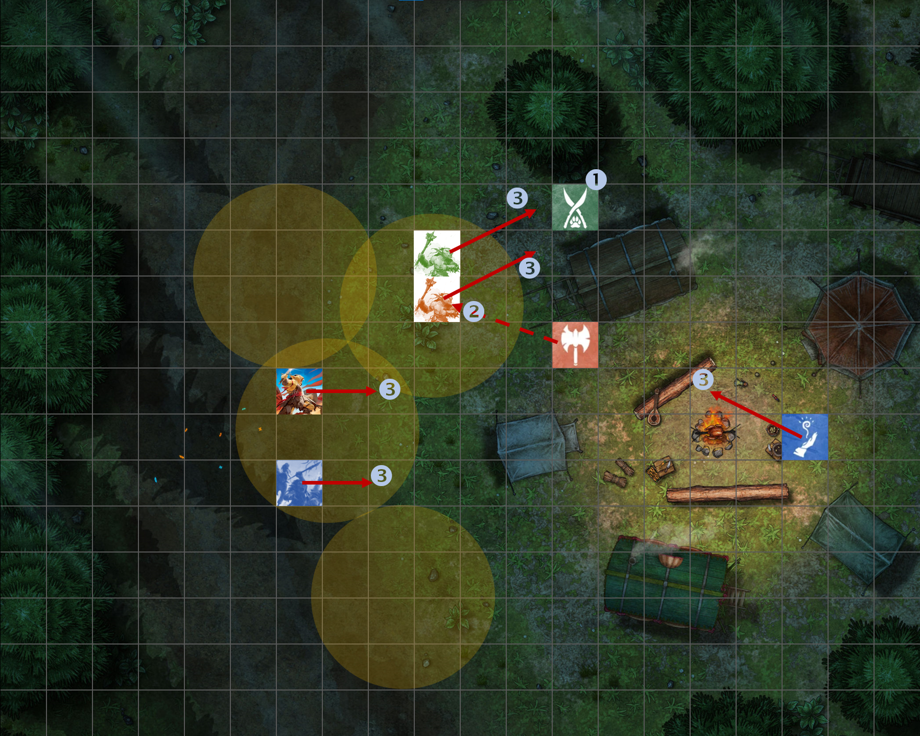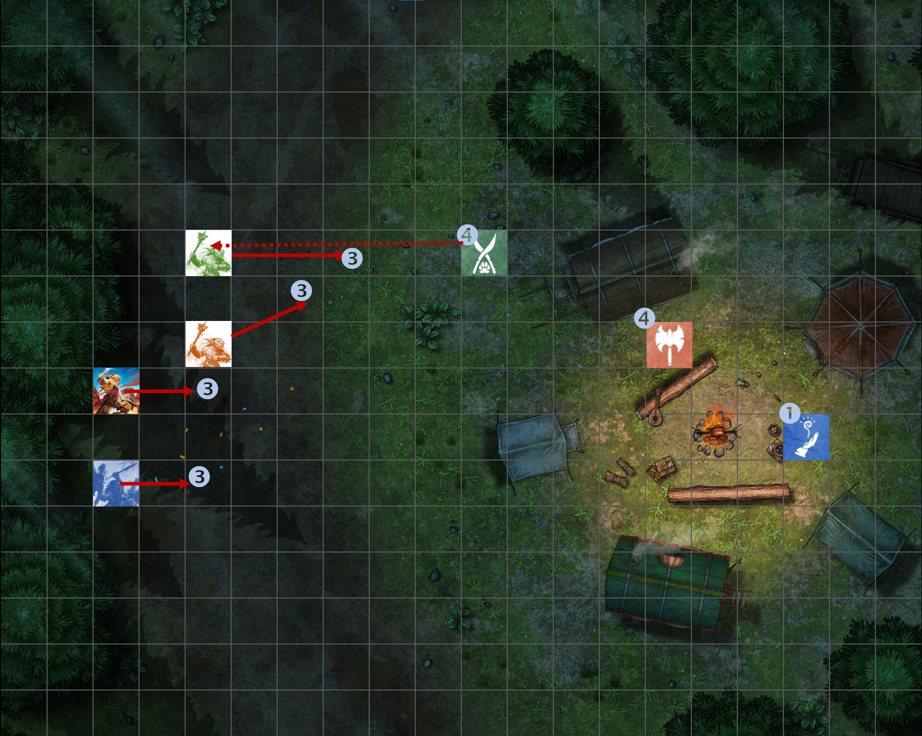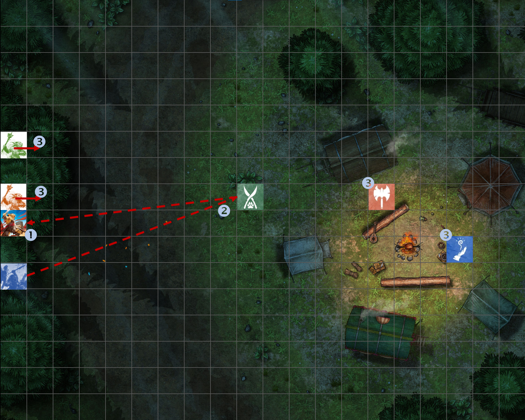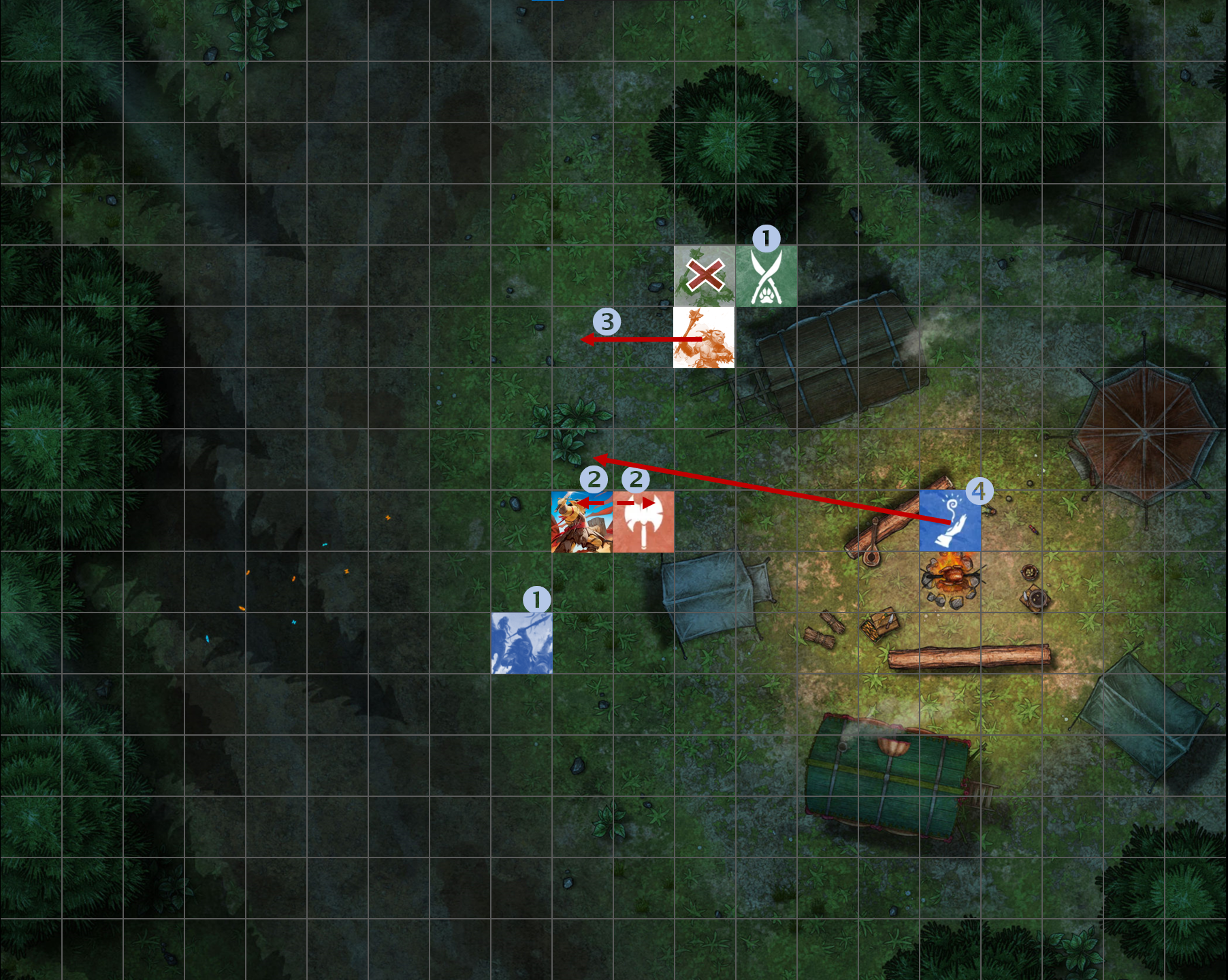 Order of resolving each step For each step, all players (DM for monsters) announce their intentions by selecting (in secret) a token (e.g. a d4 with phase number up) representing an activity in below list at start of each step. The chosen activities are reveal simultaneously by placing the token on the battlefield at the target (square). Players that do not make a choice will take the Watch activity as default option. Activities are resolved per phase in below order (to prevent conflicts)