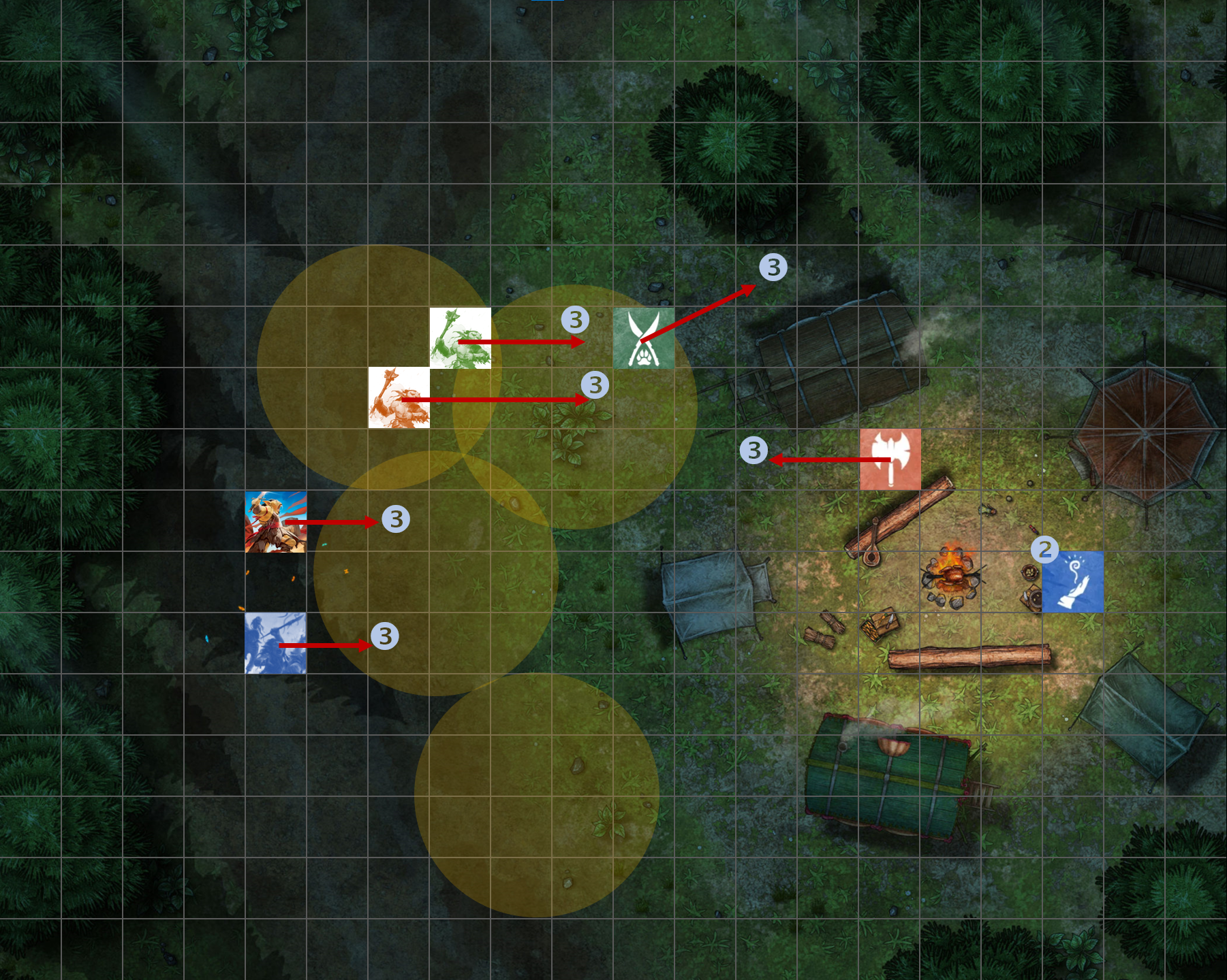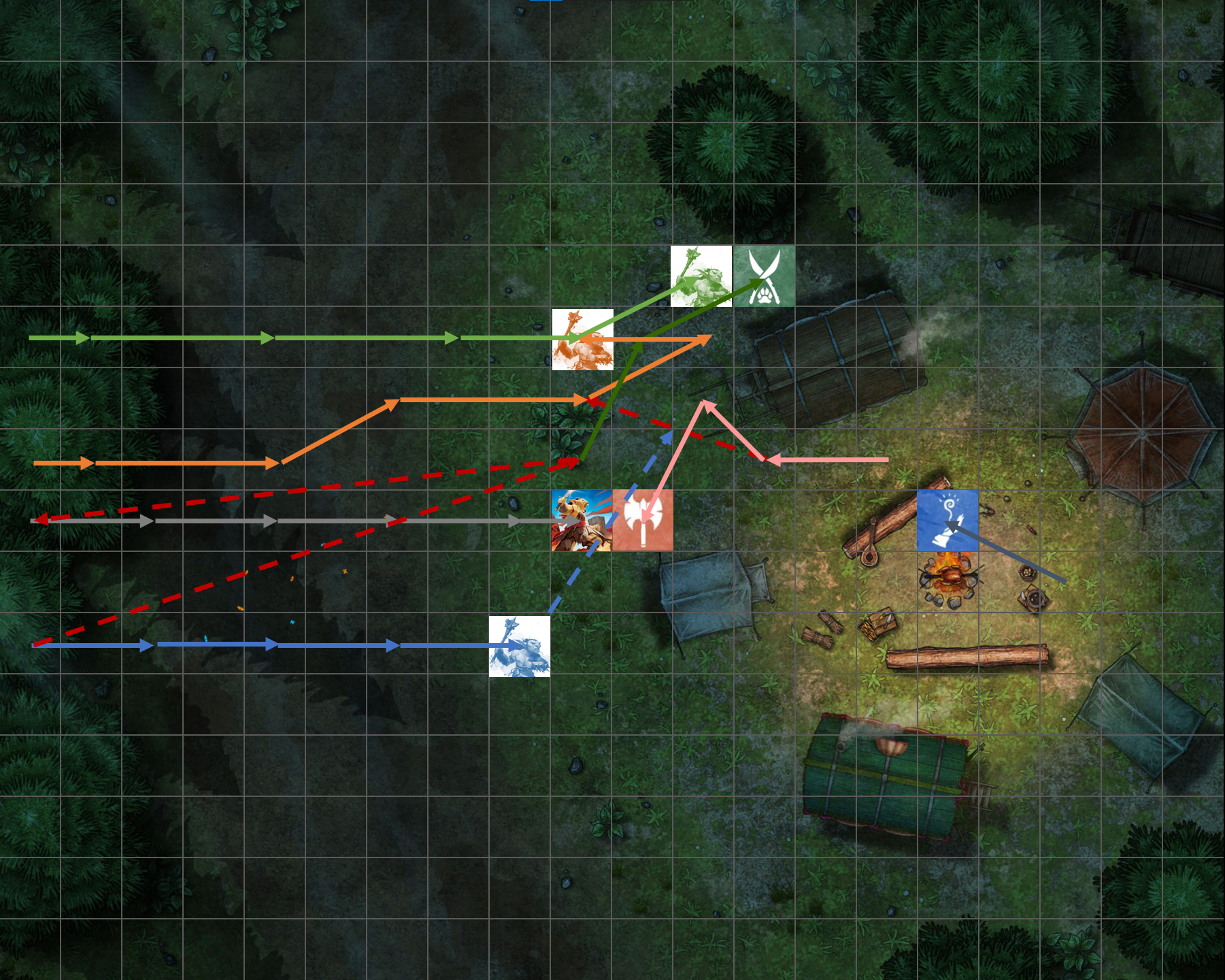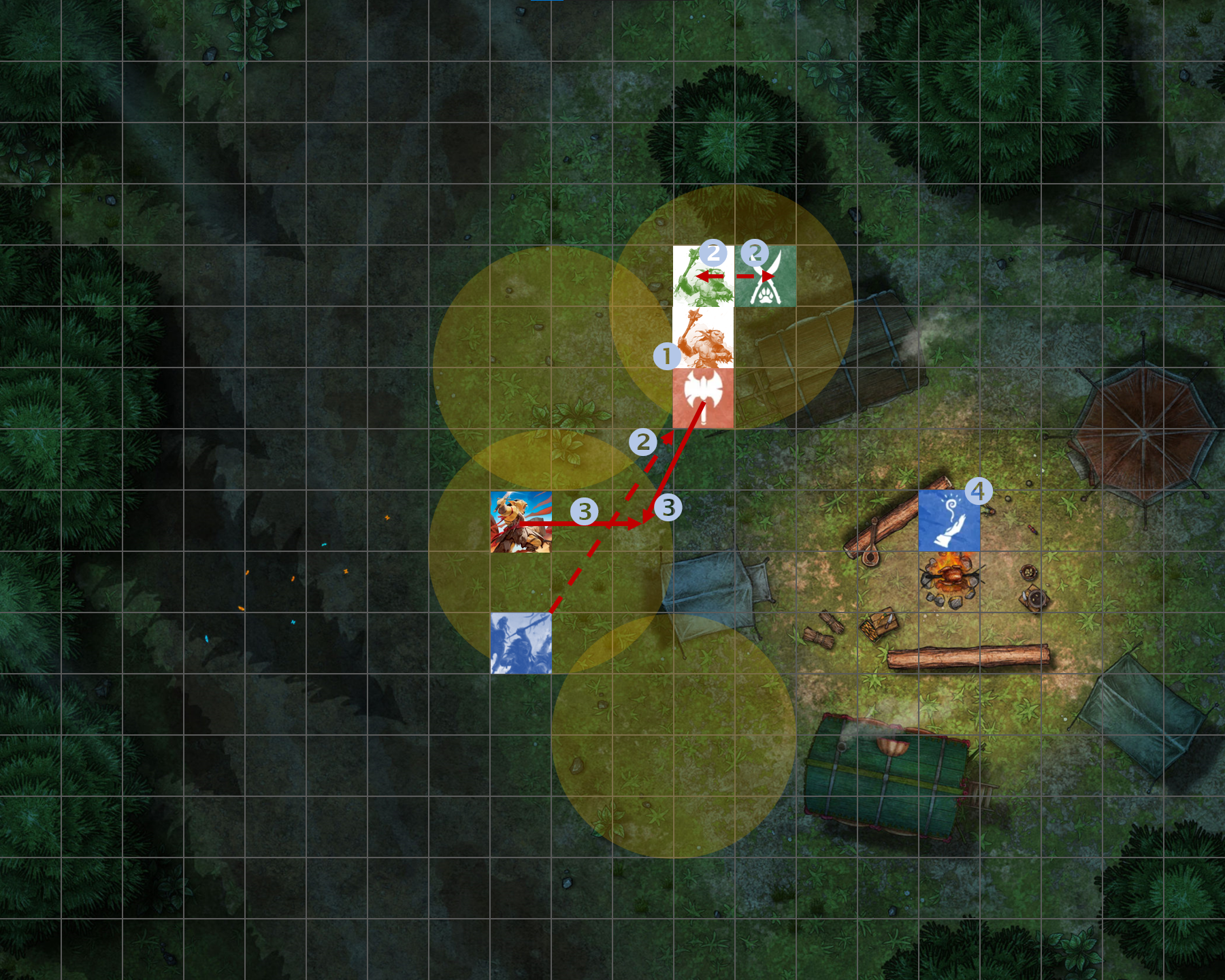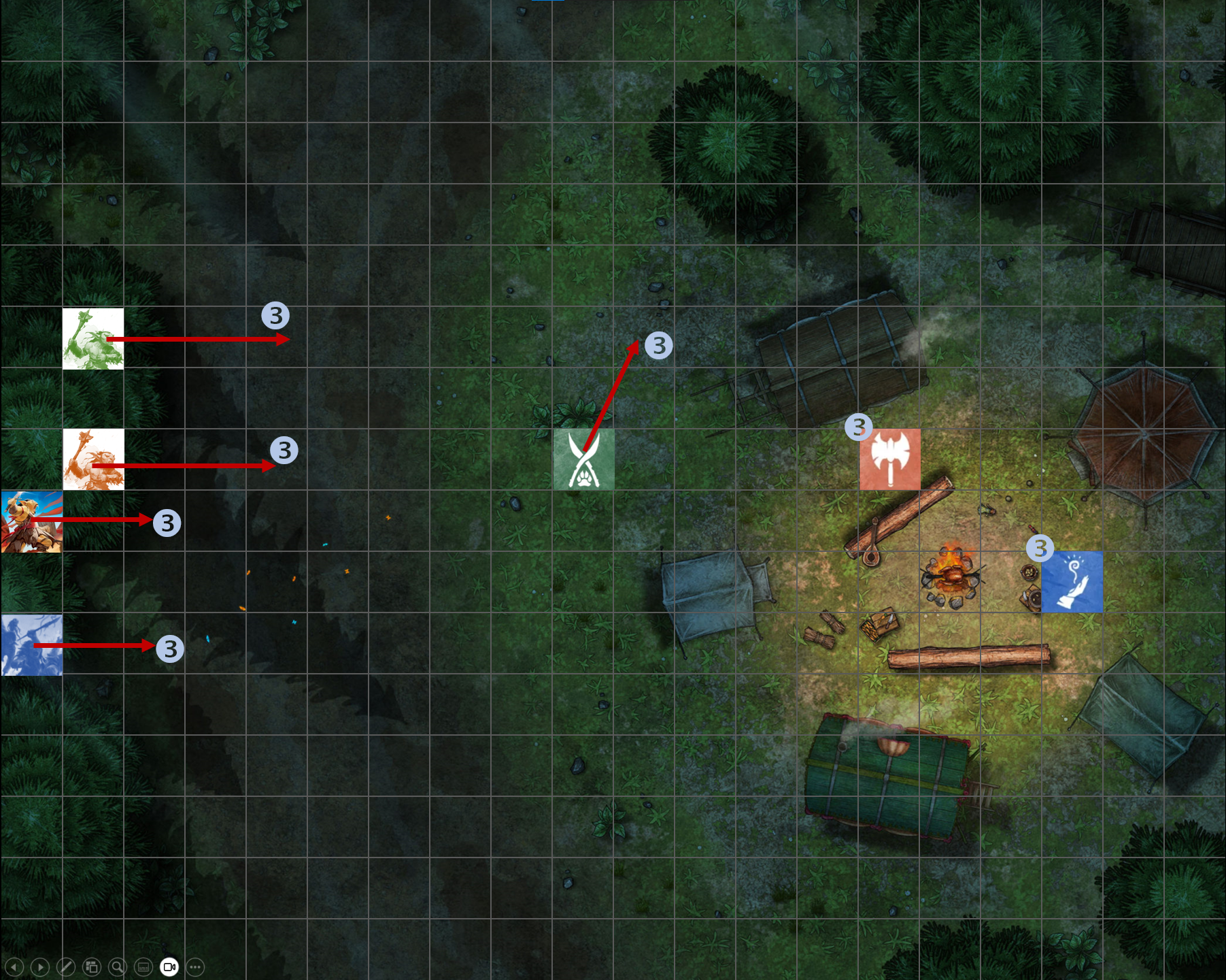 Order of resolving each step For each step, all players (DM for monsters) announce their intentions by selecting (in secret) a token (e.g. a d4 with phase number up) representing an activity in below list at start of each step. The chosen activities are reveal simultaneously by placing the token on the battlefield at the target (square). Players that do not make a choice will take the Watch activity as default option. Activities are resolved per phase in below order (to prevent conflicts)