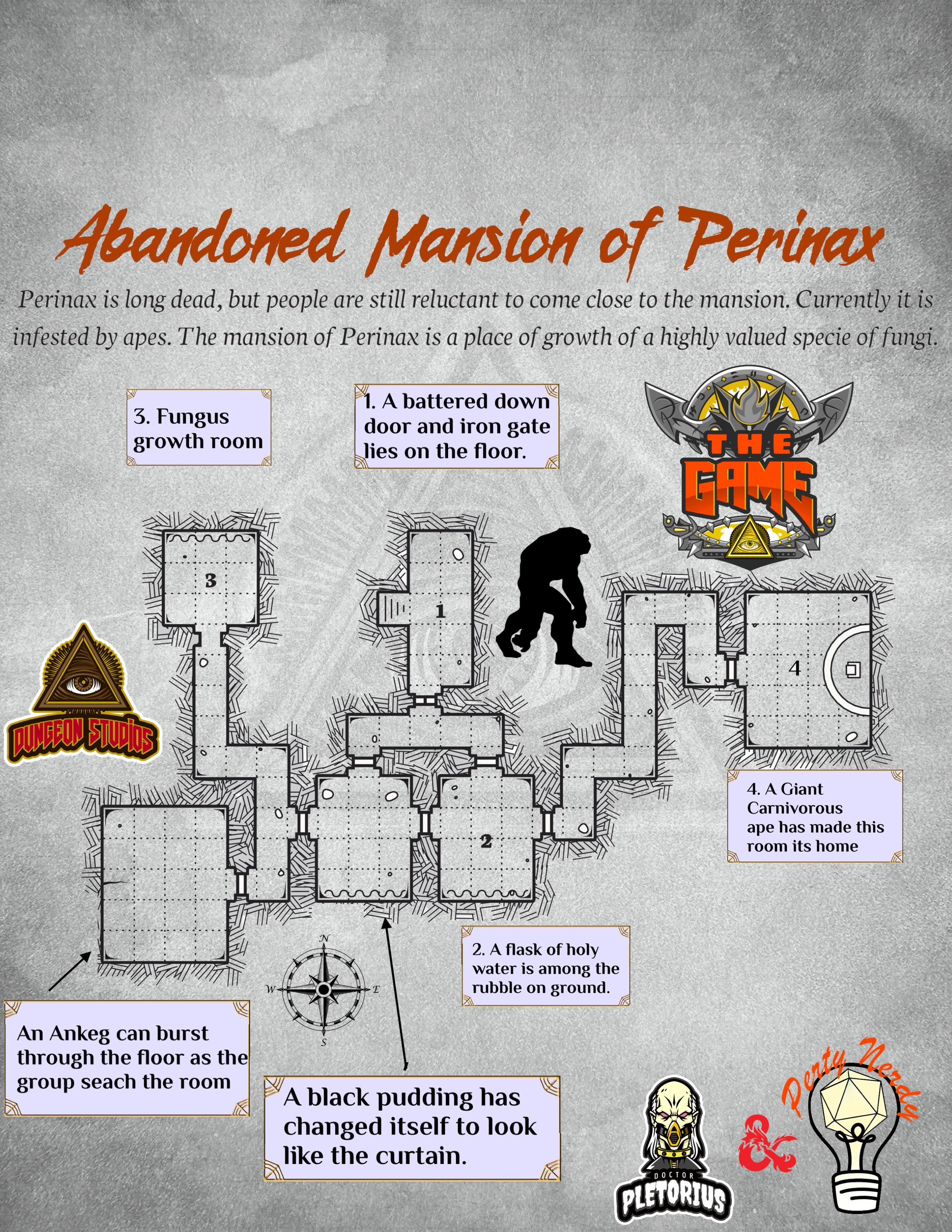 Once inhabited by the sinister Perinax, the mansion is now shrouded in mystery, guarded by a giant carnivorous ape, and home to a highly valued species of fungi. As the party navigates the mansion's treacherous corridors and rooms, they must confront the lurking horrors within, uncover Perinax's secrets, and survive the deadly encounters that await them.