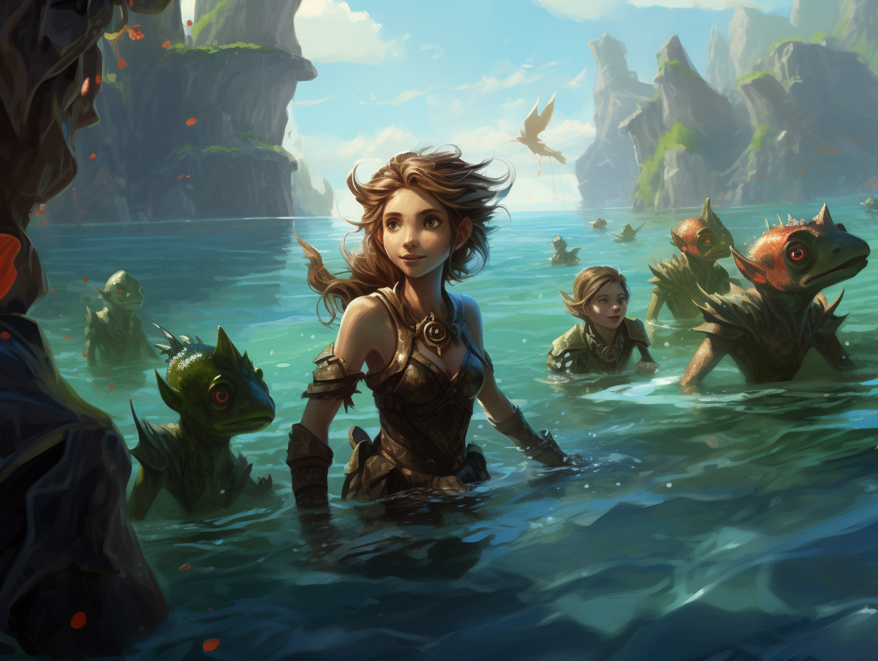 Though small in size, aquatic kobolds are effective as hunters, using their predator’s reflexes and pack coordination to trap schools of fish, or bring down even much larger prey such as plesiosaurs, by latching on by the dozens with their razor-sharp claws.