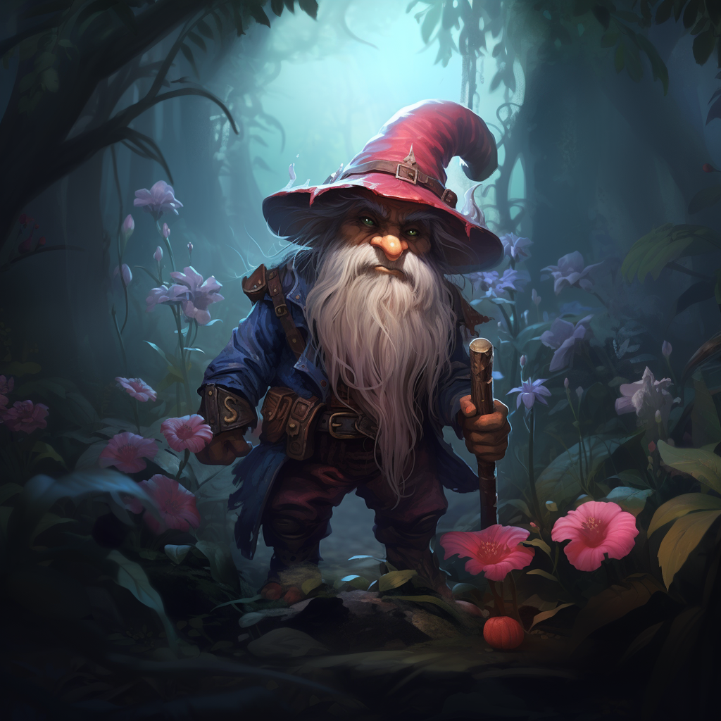 The first gnomes to venture beyond the material plane and into the Feywild were welcomed by the cunning archfey witch Grezelda who soon enslaved the entire race, forcing them to work in her gardens. There, the gnomes developed an eternal feud with the tricksy pixies, fairies, and sprites who enjoyed nothing more than seeing a garden gnome take a tumble. The gnomes soon employed their ingenuity to craft traps for the fey creatures. Emboldened by their success, the gnomes created a sophisticated trap for their captor Grezelda. Caught in the trap, the dying Grezelda uttered one last curse, turning all the gnomes into stone.