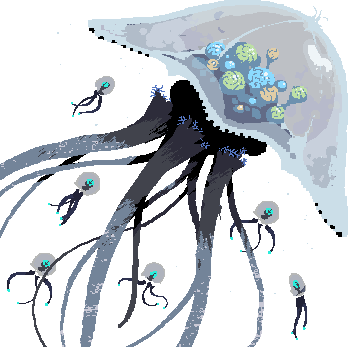 An enigmatic being swimming in the sky, the Wandering Vagrant is a giant flying jellyfish with many brains. Its thoughts and intentions are obscured to all, but having struck a deal with it you have gained a small glimpse into its mind, knowing some of its mysterious purpose.