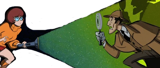 A bespectacled tinker gnome studies the glowing paint residue left on the stair railing in the abandoned house. "Jinkies!" she cries, understanding the secrets of the supposed monster that has been terrorizing the villagers.