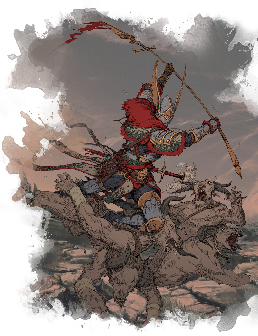 - "Battle Master" by SteveSketches (foreground): https://www.artstation.com/artwork/xJD2WX
